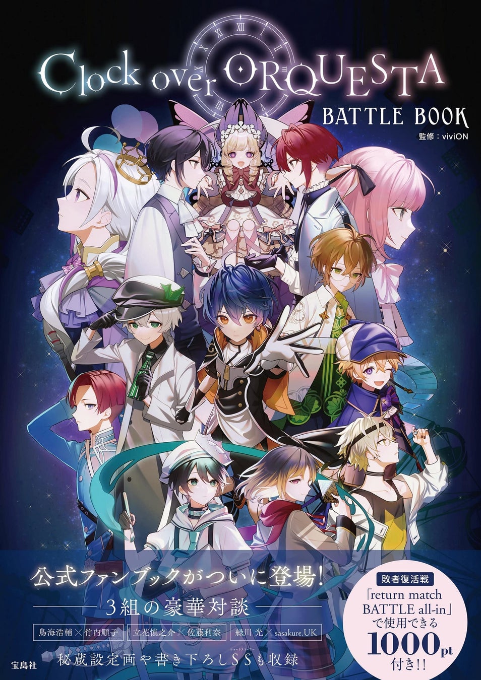 本書は、クロケスタ初となる公式ファンブックで、クロケスタでイラストを手掛ける白湯さんの描き下ろし表紙を筆頭に、登場人物の紹介や、秘蔵設定画、各キャラクターの好きな食べ物や休日の過ごし方などを聞いた“Q&A”、書下ろしショートストーリーなど、12人の魅力を堪能できるコンテンツが満載です。また、不破十紀人の青年役声優・鳥海浩輔さんと少年役の声優・竹内順子さんを含む3組の豪華対談や、皆川純子さんと金田朋子さんの楽曲収録に密着したレポート漫画、 制作スタッフインタビューなど制作秘話も収録。さらに特典として、敗者復活戦「return match BATTLE all-in」で使用できる1000ポイントの投票券がついたファン必見の一冊です!
