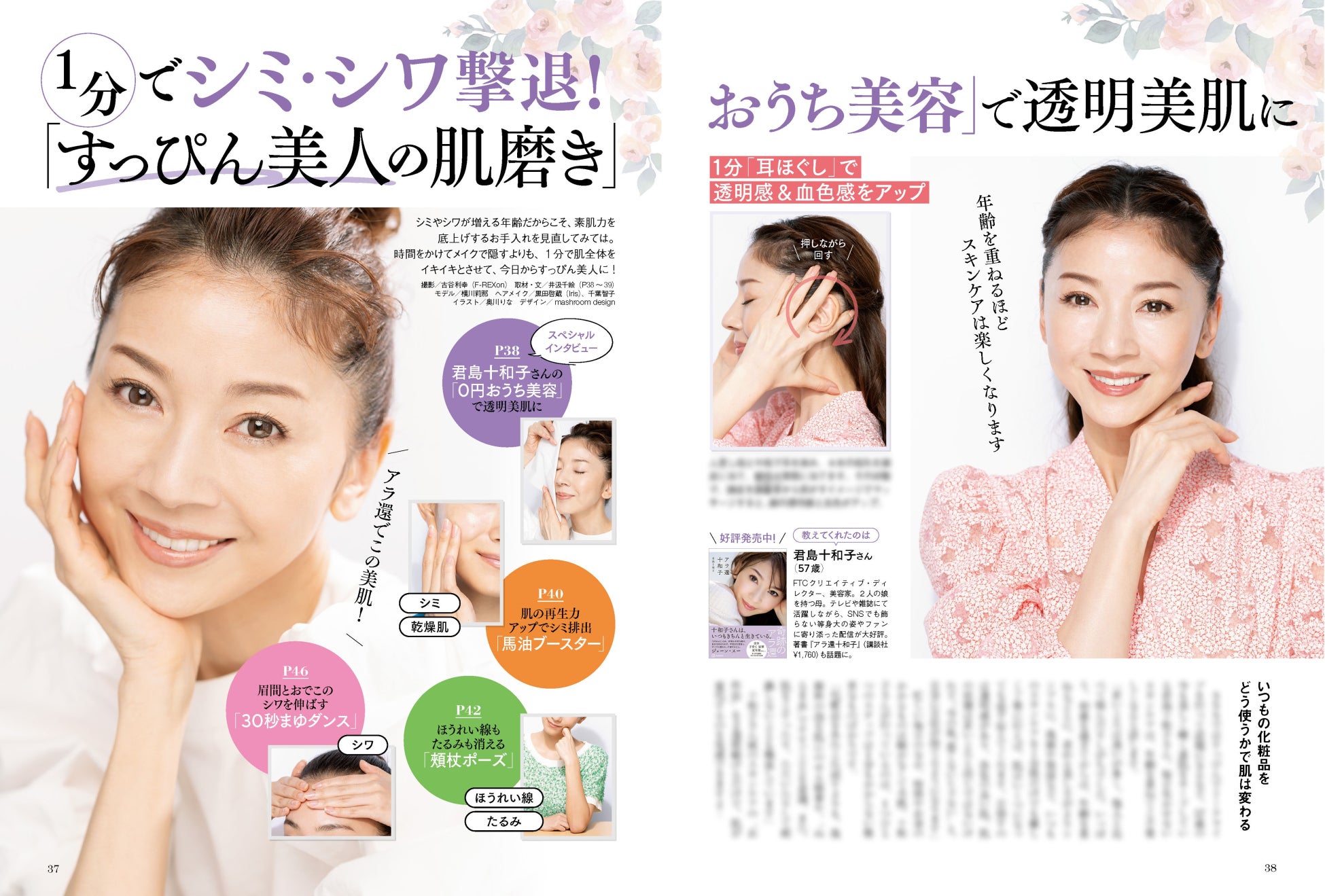美容家の君島十和子さんが登場する「すっぴん美人の肌磨き」は、1分でできる美容テクが満載。健康特集は、原因不明の不調まで解決する「脳と内臓のむくみ取り」の秘訣を紹介しています。