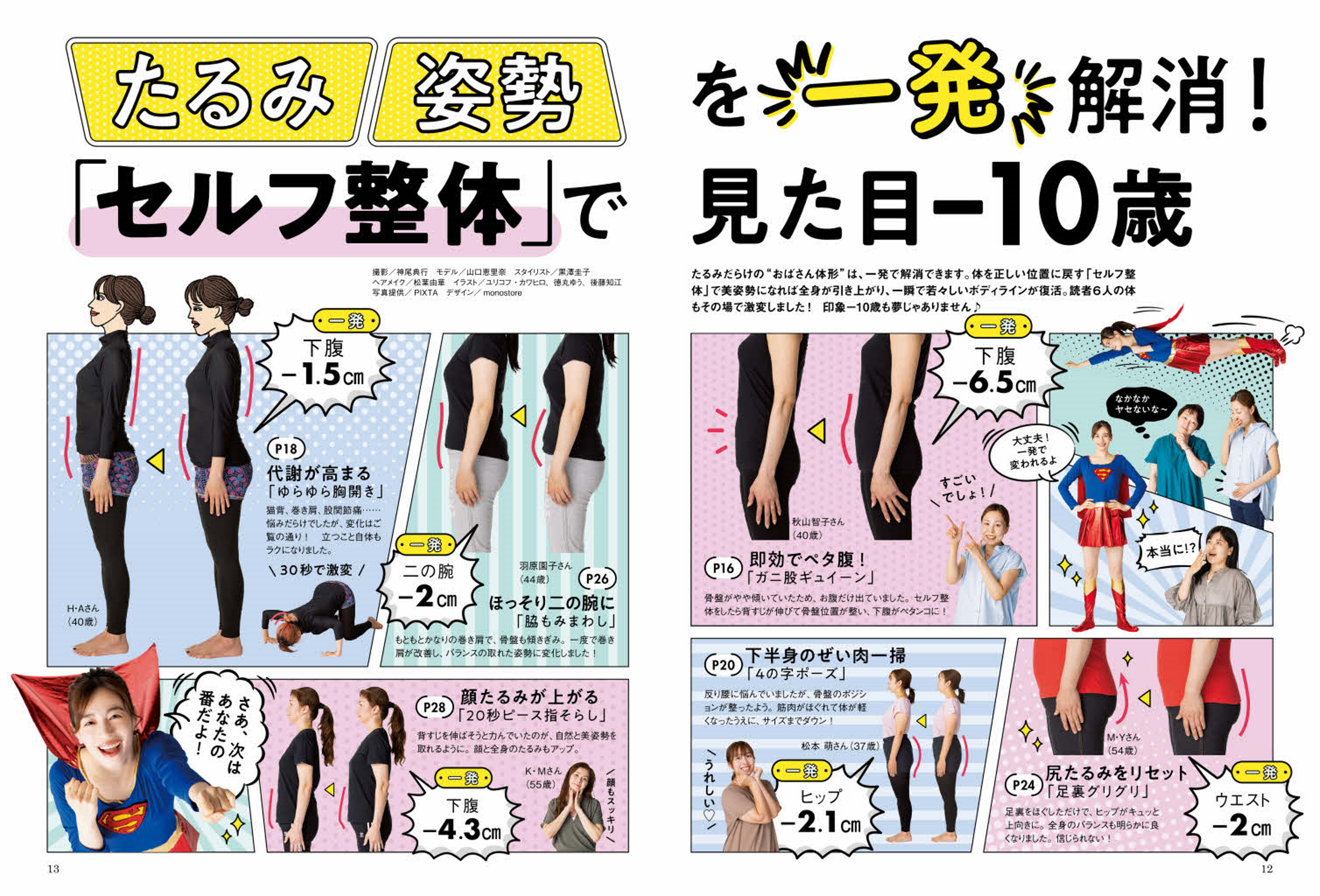 美姿勢が身につけば脂肪が勝手に燃えて、たるみのない体になれるんです! ラク~で気持ちいい「セルフ整体」で筋肉を刺激して体を正しい位置に戻せば、一瞬で若々しいボディラインが復活。読者の体をその場で激変させた “一発テク”で、今すぐ10年前の体形を取り戻しましょう。
