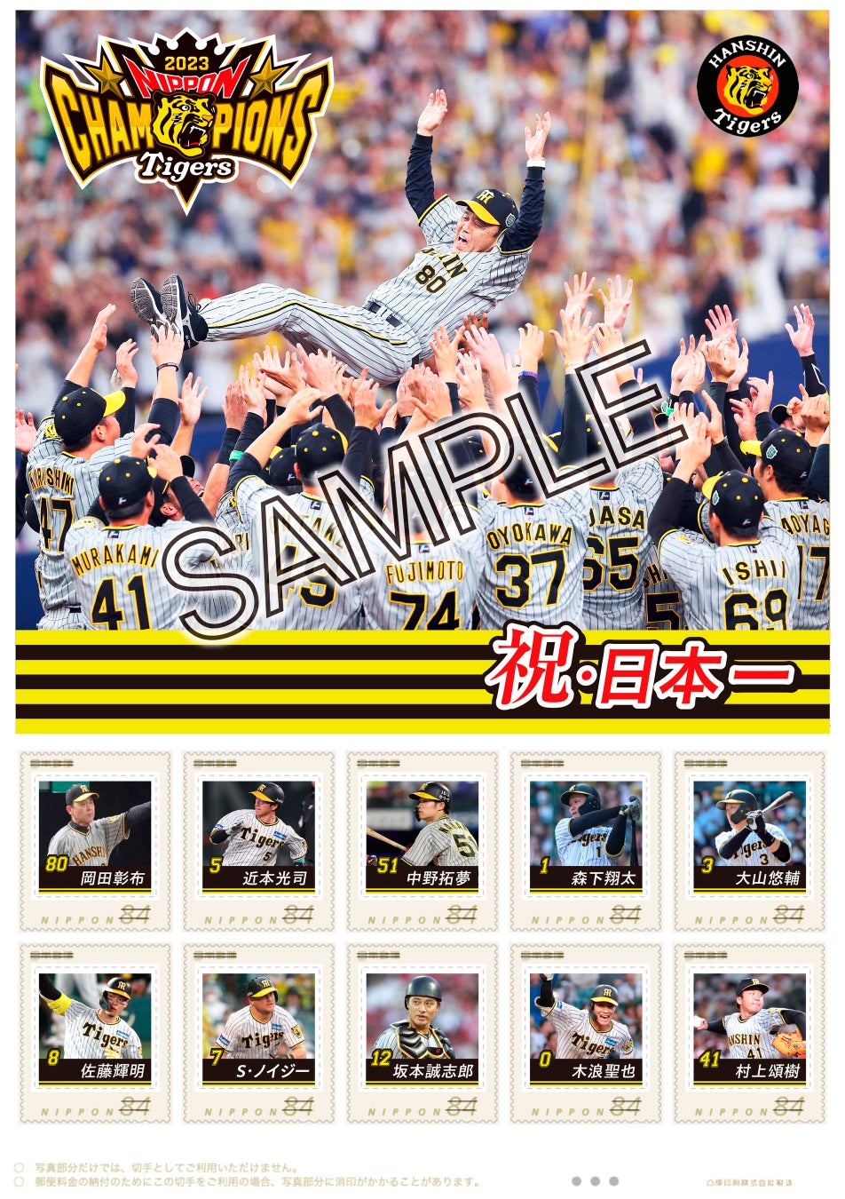 岡田彰布監督と虎戦士9人の計10枚の写真を切手に印刷。専用台紙には日本シリーズの胴上げ写真と日本一のロゴを掲載します。