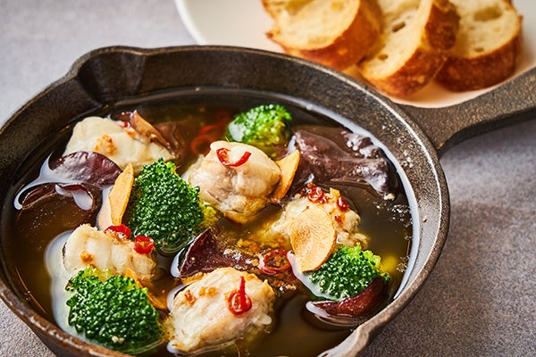 淡白ながら旨味が凝縮され、柔らかな身の食感を堪能いただける長崎県産ふぐは、ブロッコリーと生きくらげと合わせたアヒージョでお楽しみいただけます。
