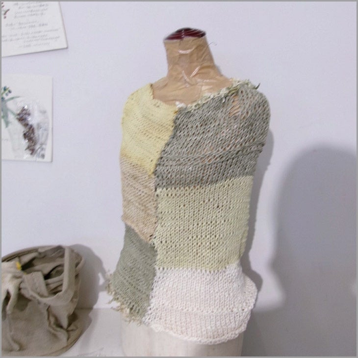 [作品名]wildflower knitting野草や昨晩飲んだ緑茶、お昼に食べたトウモロコシなど、身の回りの植物で染めて編んだニット。