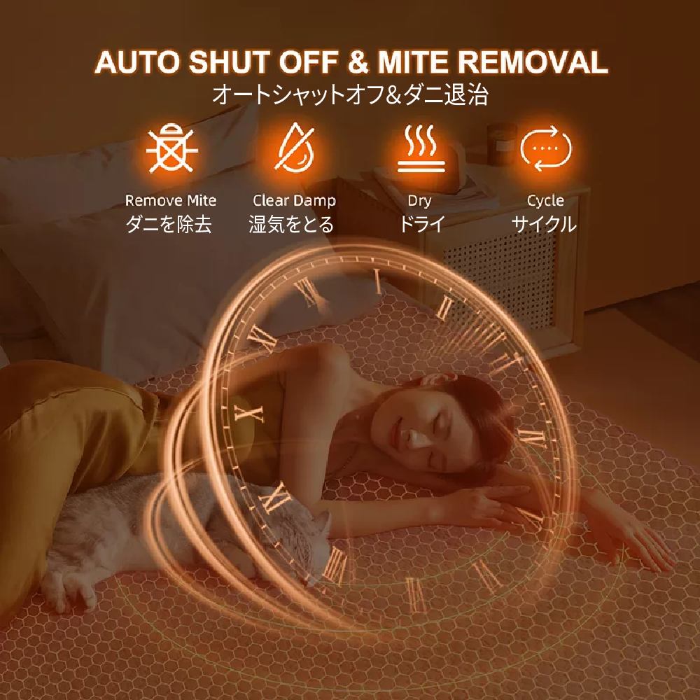 ダニ退治モードをONにすると、湿度が 49% 未満になるまで、温度は10分間で52℃の高温で電気毛布が働き続け、120分稼働すると自動で電源が切れます。