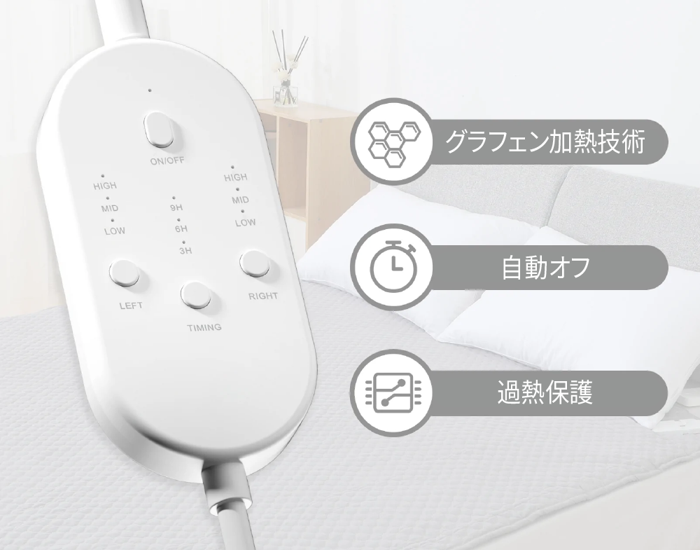 就寝の約30分前に電気毛布のスイッチを入れ、ギアを「高」に調整して予熱することをお勧めします。就寝後に連続して使用する場合は、ギアを「低」にしてください。