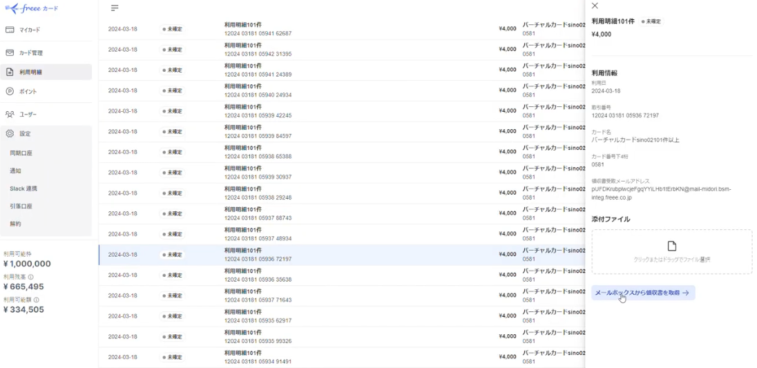 freeeカード Unlimited、メールに添付された領収書をカード利用明細に紐付け