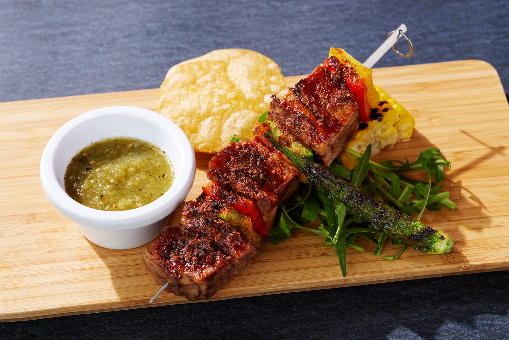BBQソースと塩胡椒でマリネした牛バラ肉を、LAVAROCK名物の溶岩石グリルで香ばしく焼き上げた、豪快な一本。サクッとした食感がアクセントの自家製トルティーヤと、グリーントマトに唐辛子とパクチーを効かせた、スパイシーで食欲そそる「サルサヴェルデ」とともにお召し上がりください。