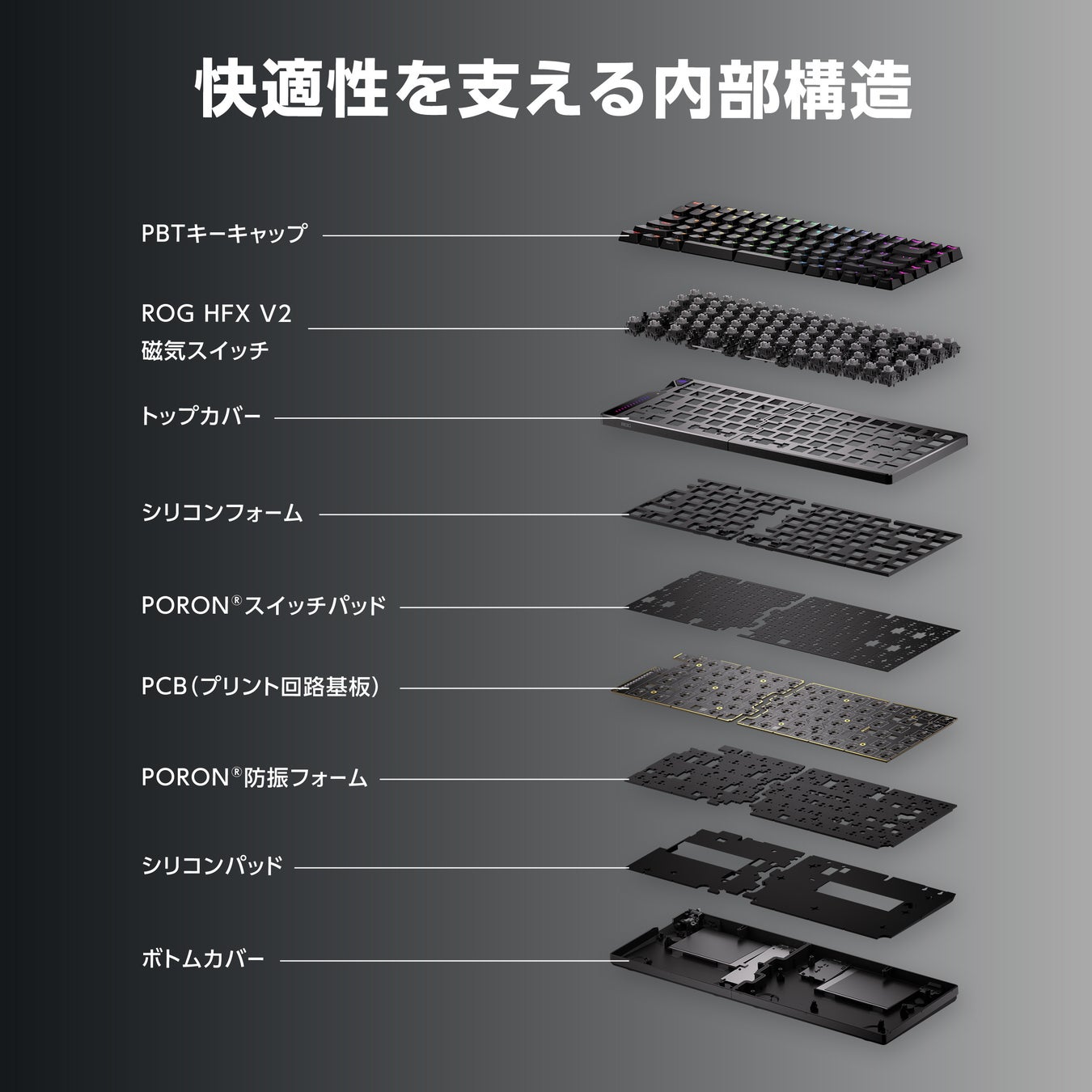ROG HFX V2磁気スイッチ:潤滑済みの最新磁気スイッチで、極めて精密かつ高速な打鍵感と、1億回の耐久性を実現します。0.01mm単位で作動点を調整できるため、打鍵感を細かくチューニング可能です。またスイッチはホットスワップ対応交換も簡単に行えます。