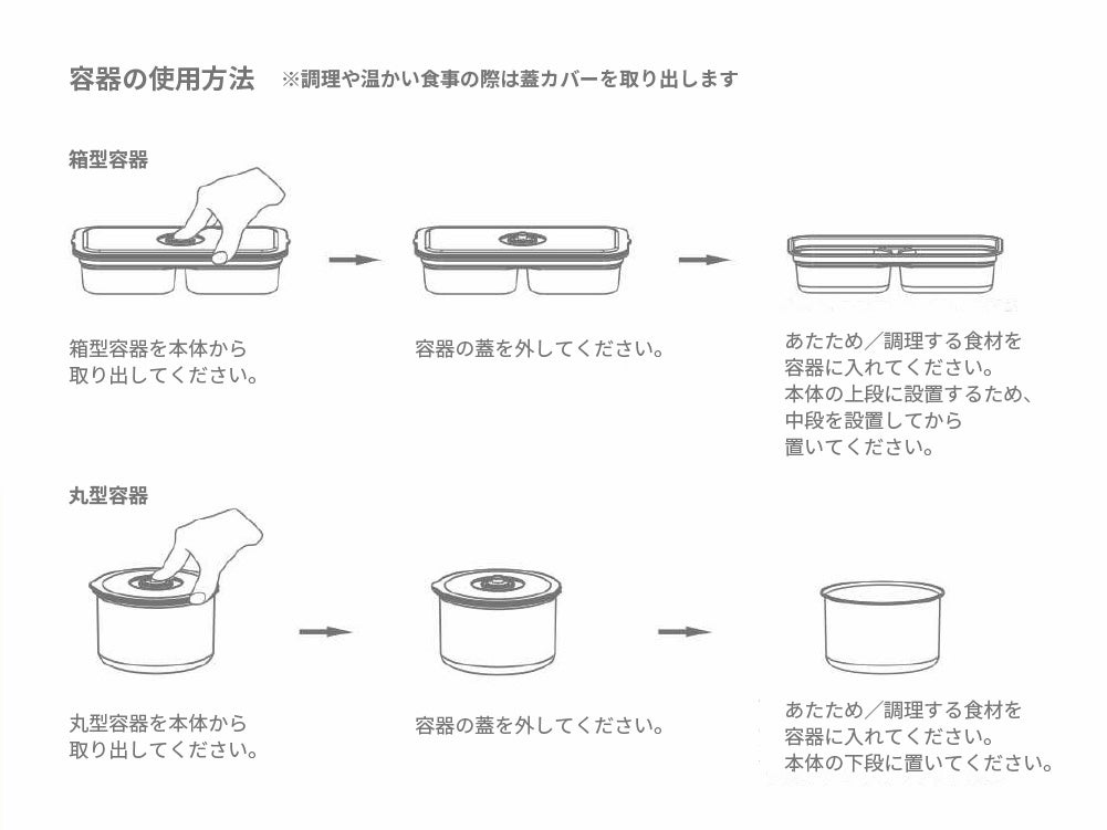 各容器に専用蓋が付属しておりますが、温めや調理時にはスチームの効果を得るために使わないでください。蓋は、持ち運びの際や、冷蔵庫などに料理を個別保管する際に、本体から各容器を取り出してお使いいただくことができます。