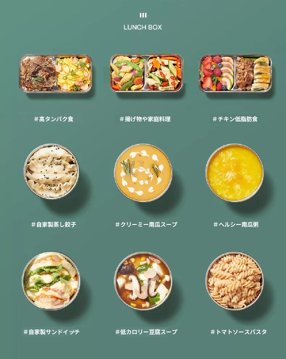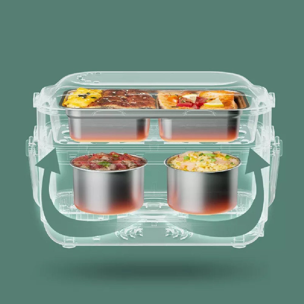 - 2段で3容器がコンパクトにまとまって持ち運べる。同時におかず・副菜・ご飯を温めと、様々な料理のバリエーションに対応