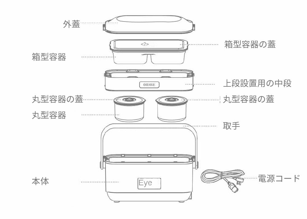 本体、丸型容器×2、箱型容器、中段仕切り、各容器の蓋、電源ケーブル