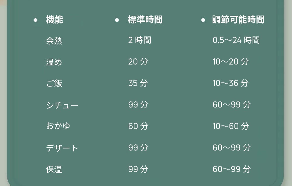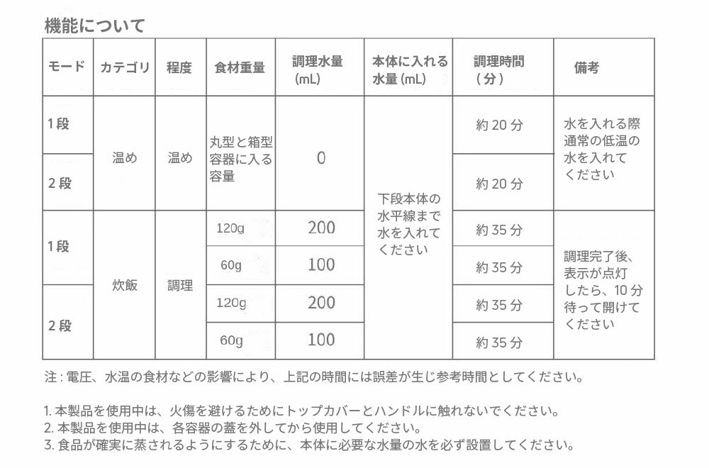 - 機能と調理の目安と参考例