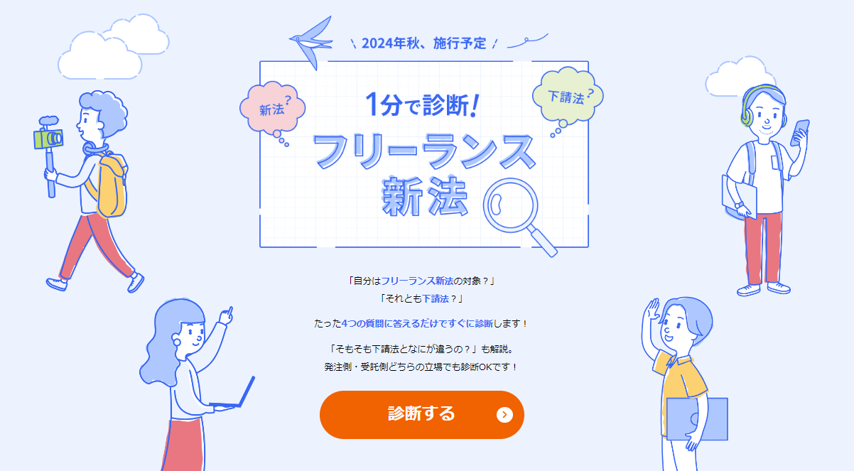受注者・発注者それぞれどんな対応が必要なのか診断できるサイト「1分で診断!フリーランス新法」も公開中です。本サイトでは、4つの選択式の質問に答えていくだけで、下請法・フリーランス保護新法の対象か診断します。また、具体的に発生する作業や注意点を解説します。