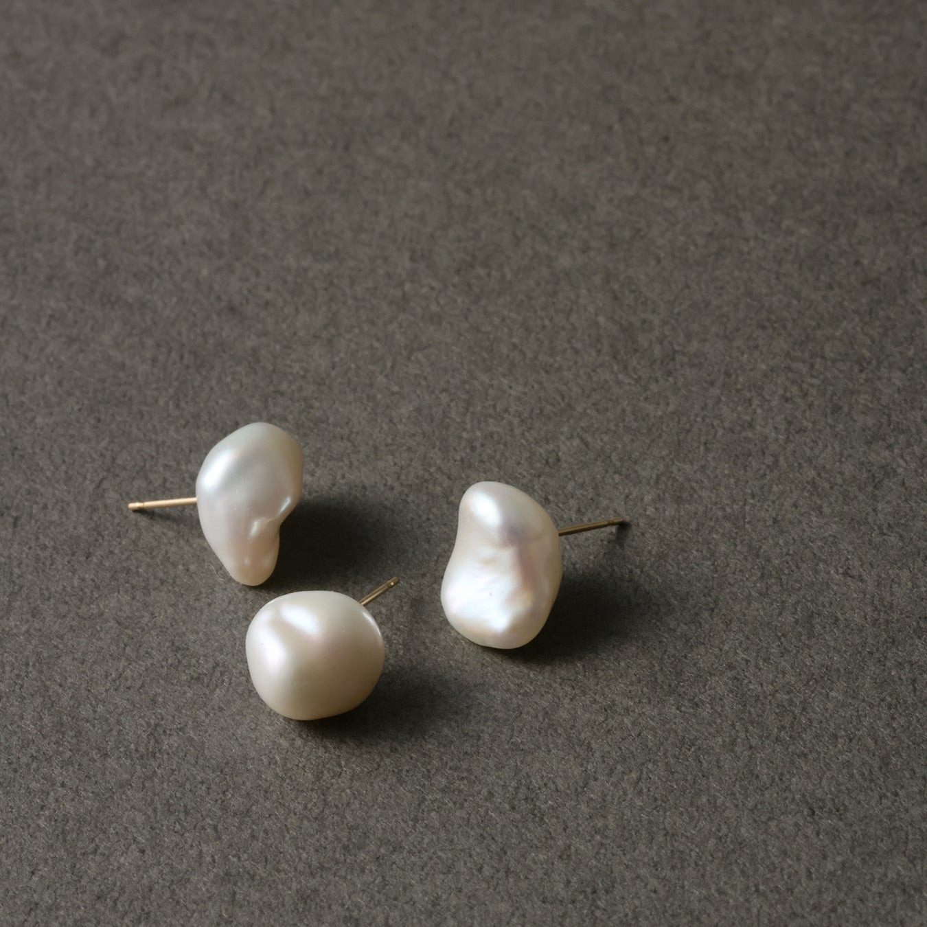 いびつな形のバロックパールを、シンプルなスタッドピアスに仕立てました。