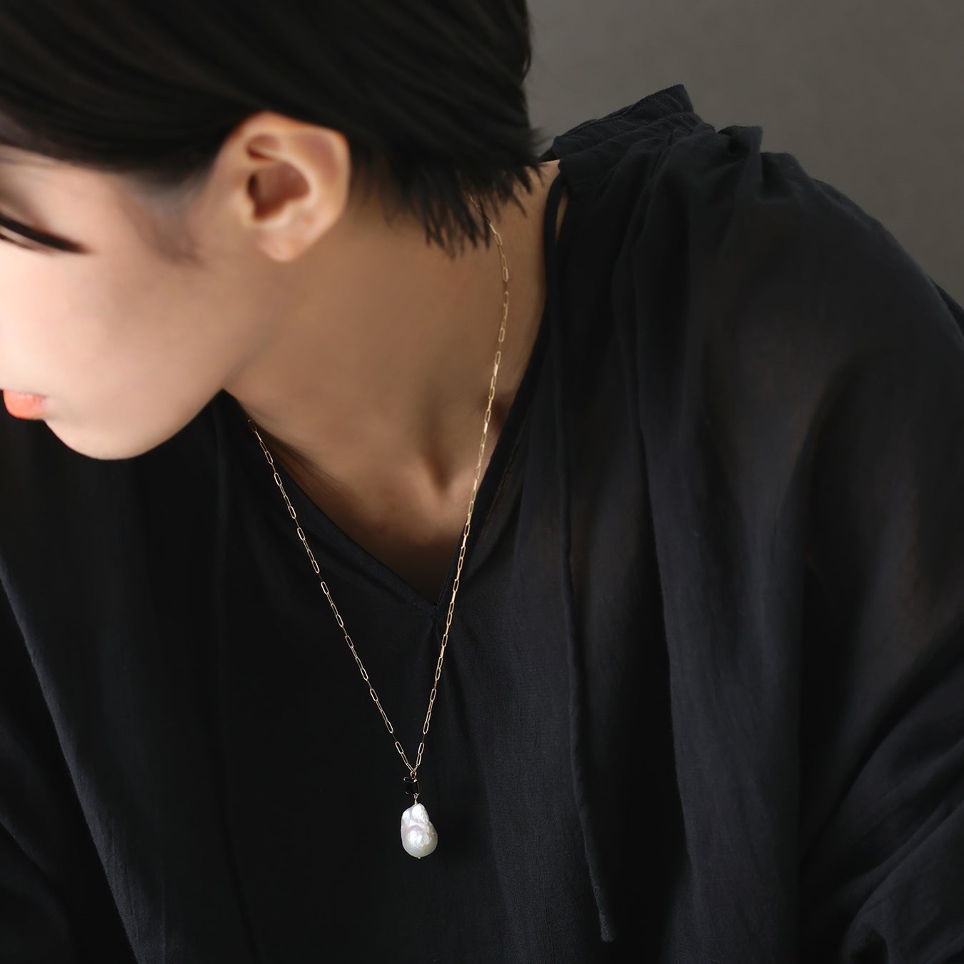 ネックレスチェーンには、ペーパークリップチェーンを使用することで、抜けのある印象に。