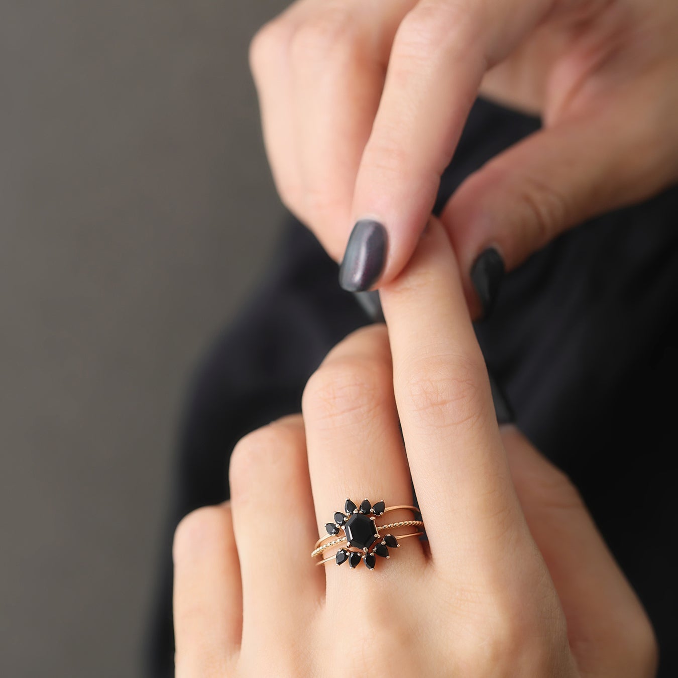 5つのオニキスが輝くリングは、指に沿うように天然石をセット。