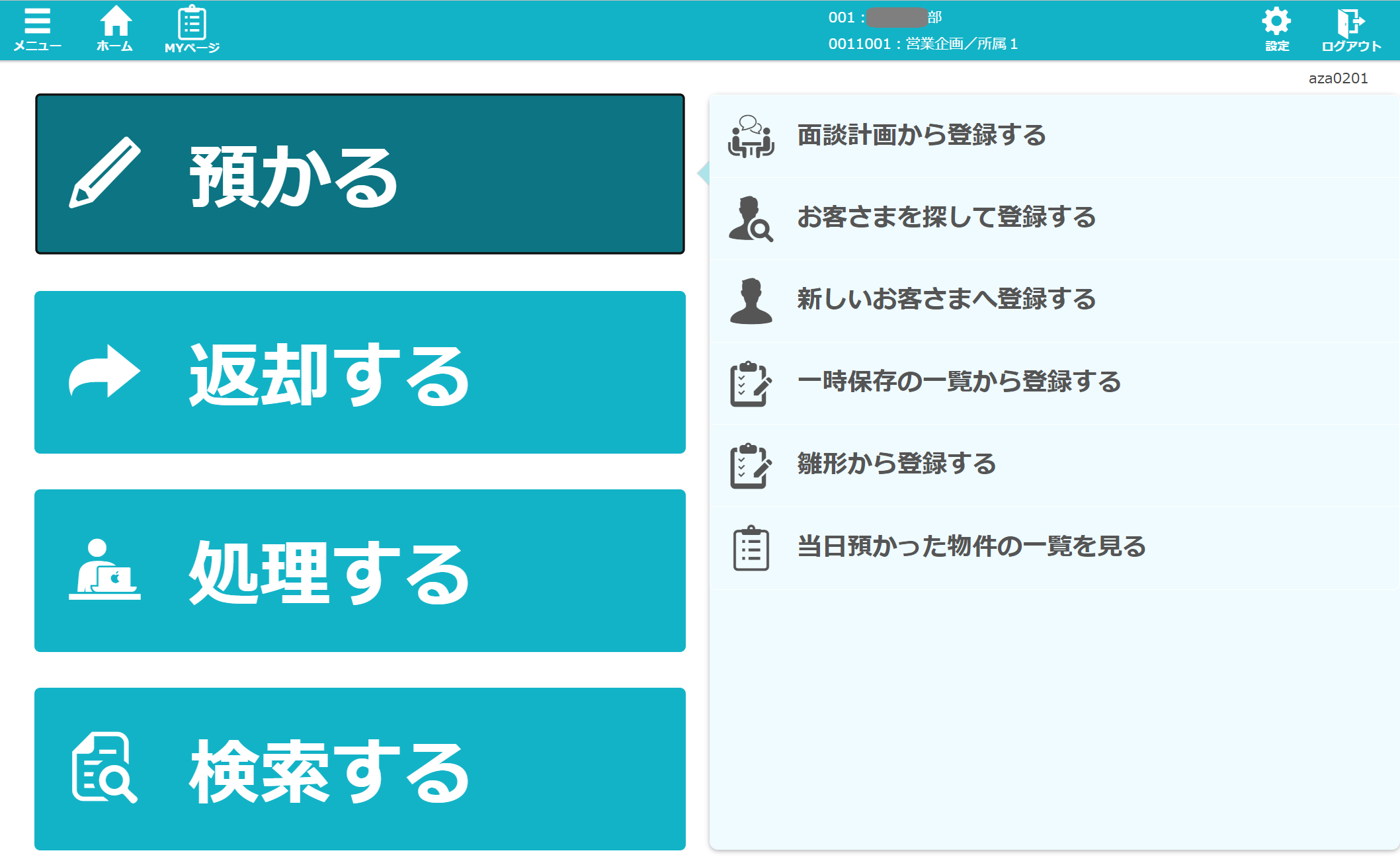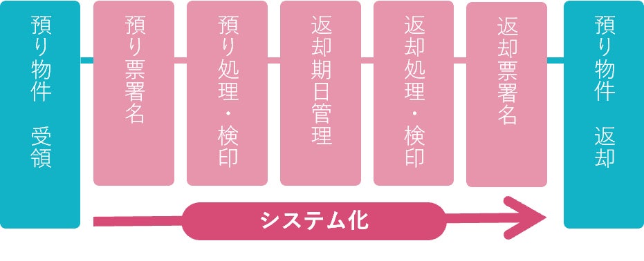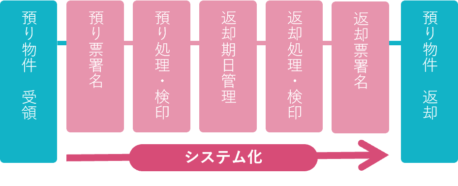 預り物件の登録から行内管理、返却までのプロセスをシステム上で一元管理できます。