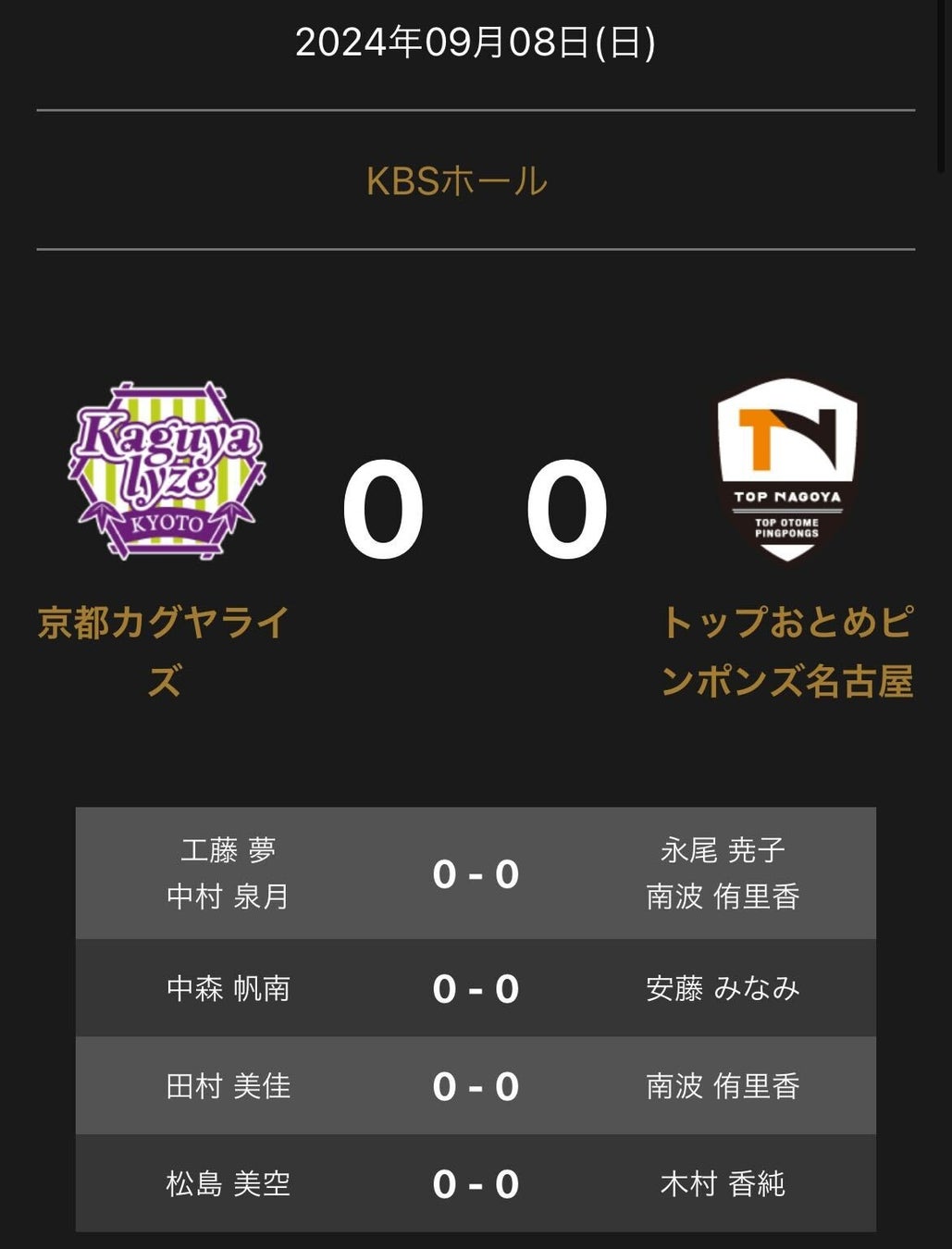ノジマTリーグ 2024-2025シーズン 公式戦 9月8日開催 京都カグヤライズvs トップおとめピンポンズ名古屋対戦オーダー発表