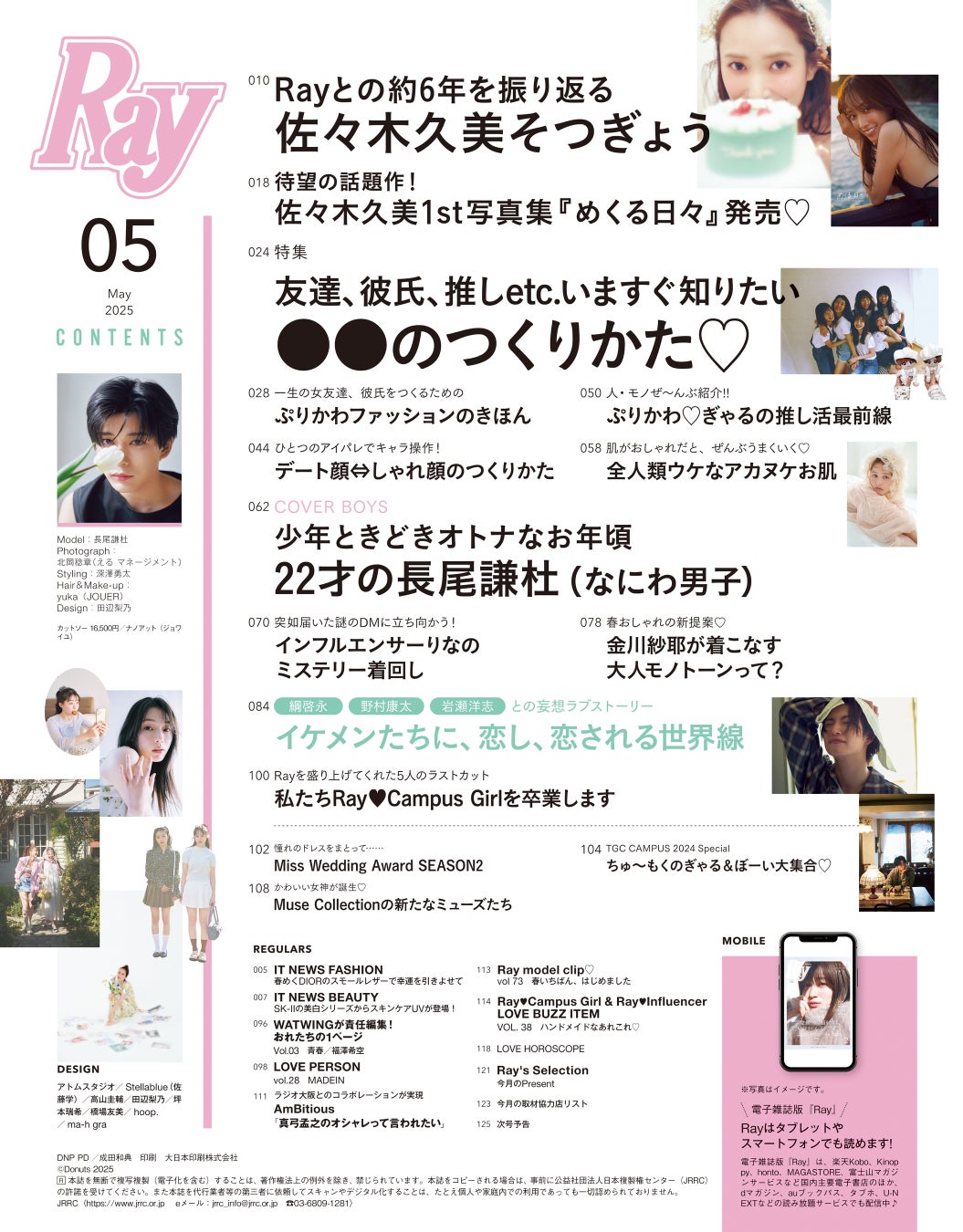 『Ray』2025年5月号は3月22日(土)発売!通常版表紙は今号で専属モデル卒業の佐々木久美、特別版表紙はなにわ男子の長尾謙杜さんが『Ray』ソロ初表紙を飾る!