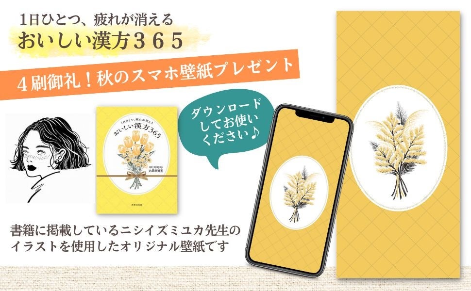 ご好評への感謝をこめ、「おいしい漢方365 秋のオリジナルスマホ壁紙」を無料配布いたします。本書の挿画をご担当頂いた大人気のイラストレーター・ニシイズミユカ先生による書籍内の扉絵を使用したオリジナル壁紙。下記リンクより画像をダウンロードして、書籍と一緒にお楽しみください。眺めているだけでほっとする、秋色の壁紙です♪