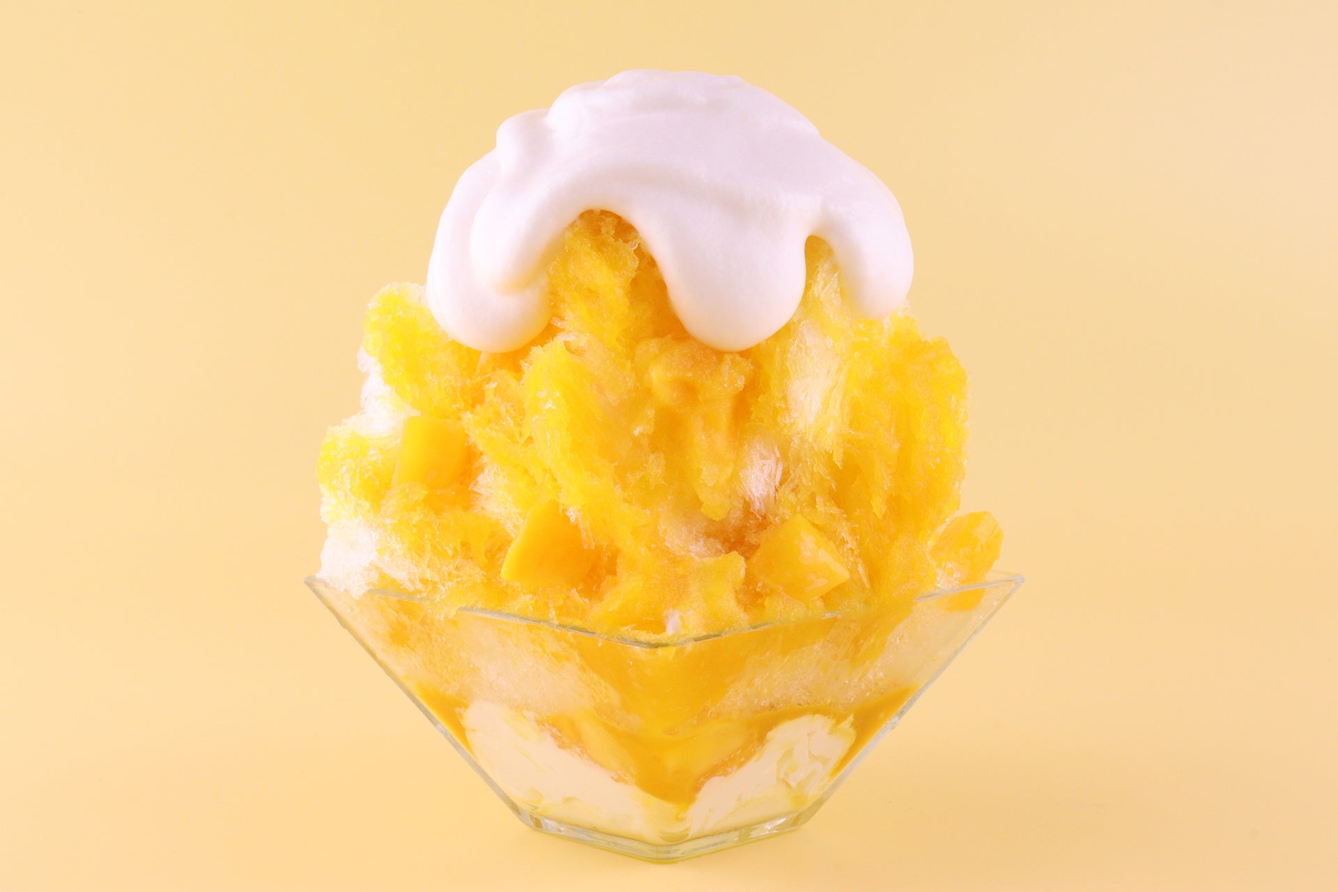 氷の中にはくちどけなめらかなマンゴームース、トッピングにもマンゴーを使用した鮮やかな一杯。