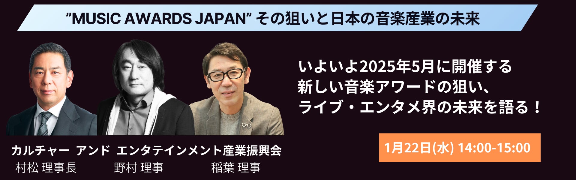 日本音楽制作者連盟の理事長でありMAJ実行委員会委員長の野村達矢、日本音楽出版社協会の会長でありMAJ実行委員会副委員長の稲葉豊、日本レコード協会会長でありカルチャー アンド エンタテインメント産業振興会理事長の村松俊亮の3人が本アワードの狙いと、日本の音楽産業・エンターテイメント業界の未来を語る。