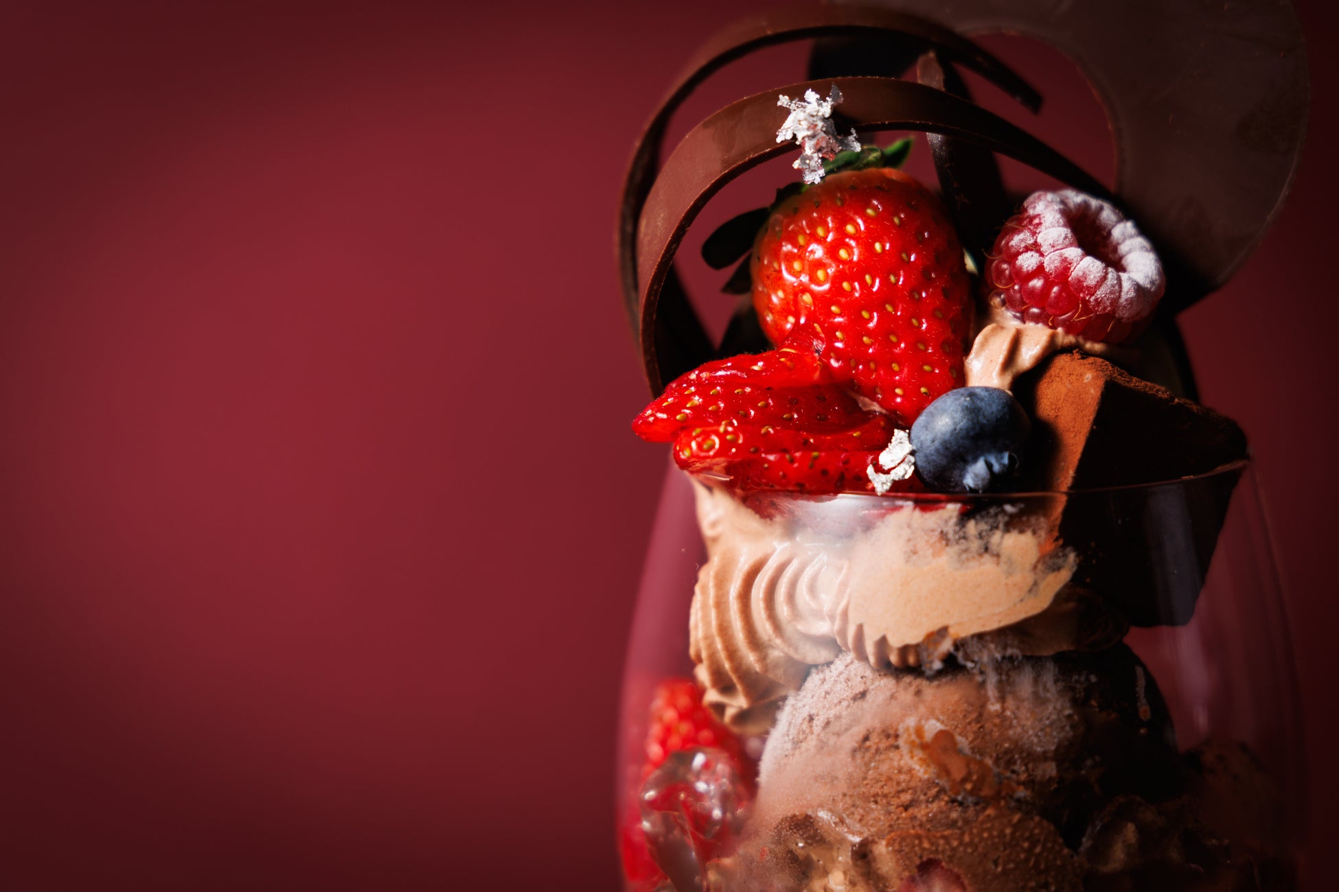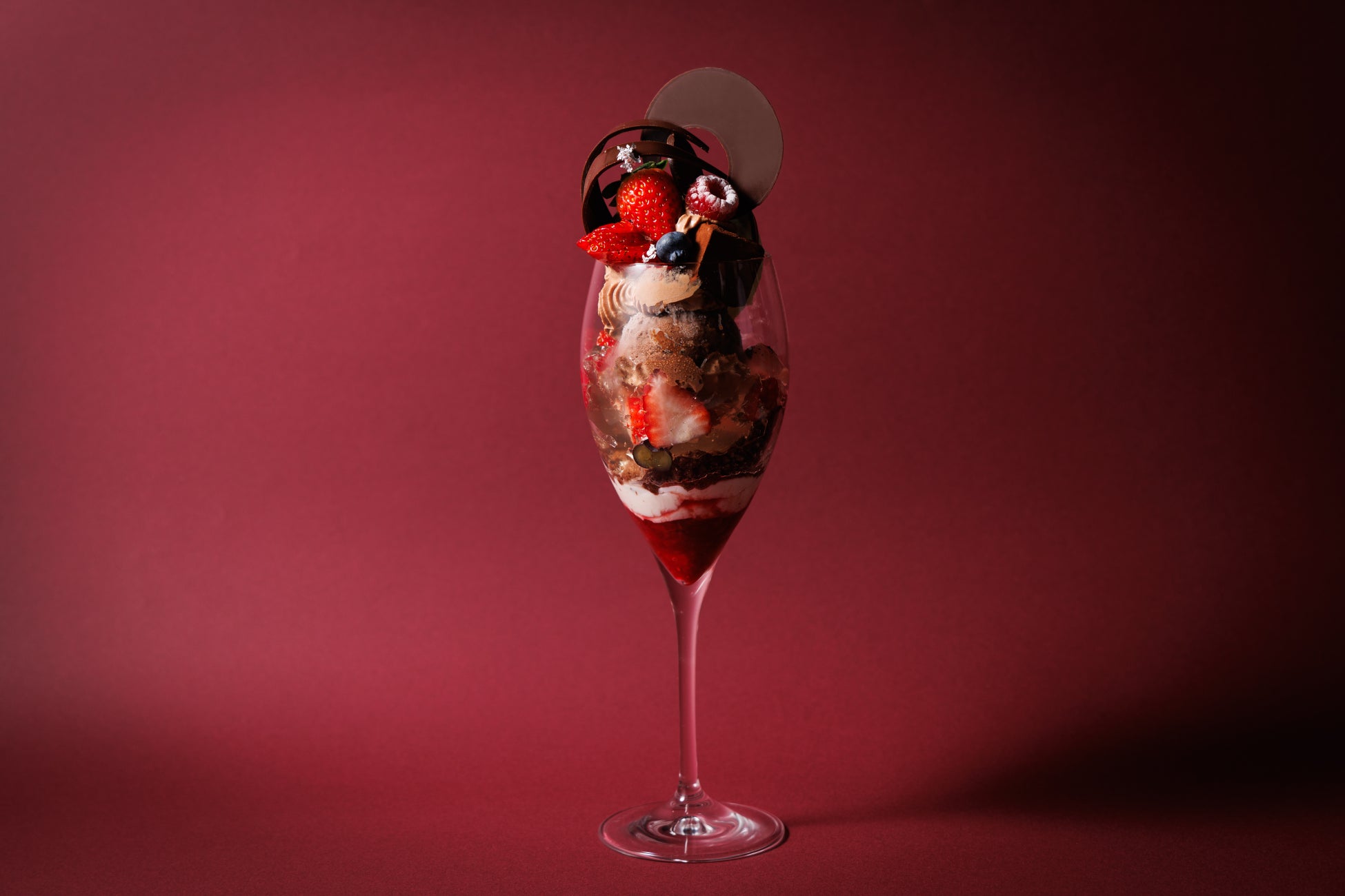 甘酸っぱいいちごと濃厚チョコの贅沢ハーモニー 大人のためのご褒美パフェをティータイムにご提供。