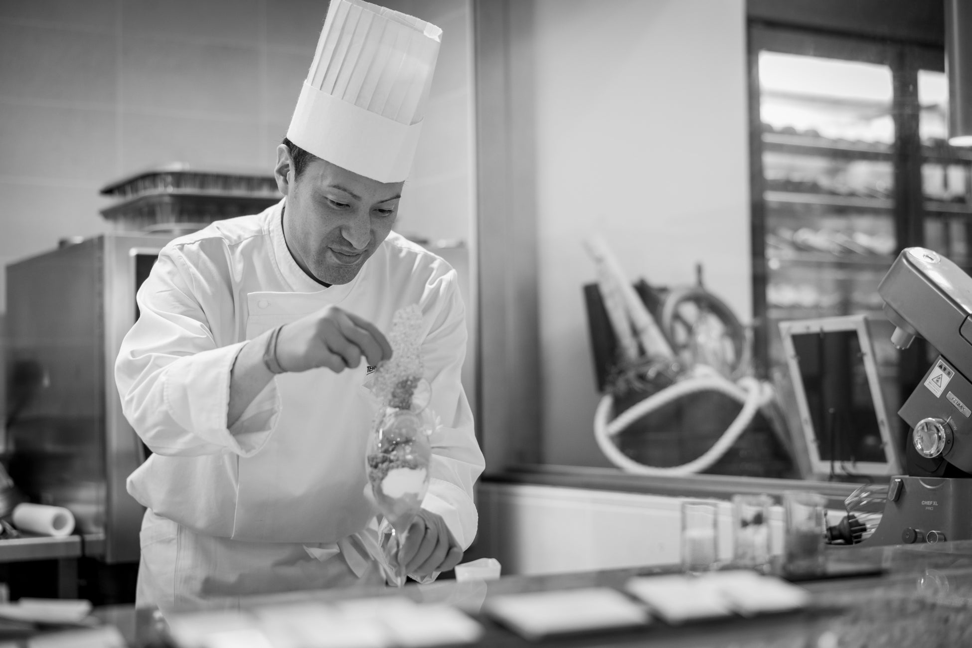 パフェのトップには贅沢に並べられたチョコレートが重なり、その奥深い風味を存分にお楽しみいただけます。その下には、濃厚ながらもさっぱりとしたピスタチオのアイスクリーム、八角を使用したパンナコッタ、さらにレモングラスのジュレが層を成し、最後まで軽やかな甘さが続く味のバランスが特徴です。