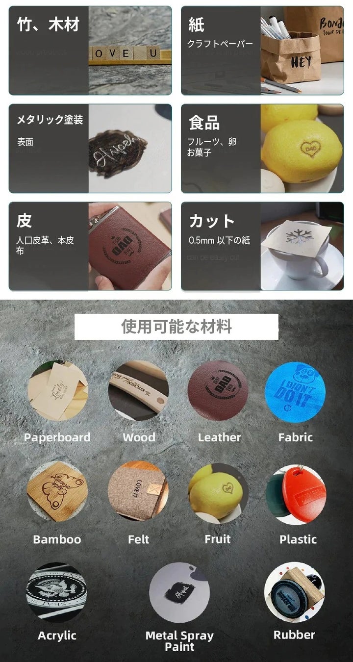 木材、竹材、アクリル、皮革、紙、布、羊毛、ダンボール、食品、果物、プラスチック、