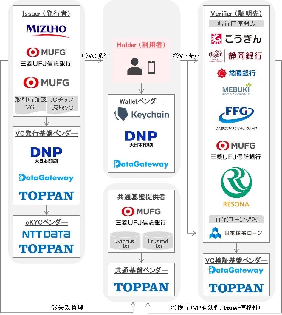 TOPPANホールディングスのグループ会社であるTOPPANデジタル株式会社(本社:東京都文京区、代表取締役社長:坂井 和則、以下 TOPPANデジタル)とTOPPANエッジ株式会社(本社:東京都港区、代表取締役社長:添田 秀樹、以下 TOPPANエッジ)は、金融庁の「FinTech実証実験ハブ」の支援案件に採択された、犯罪収益移転防止法(以下、犯収法)に基づいた取引時確認をデジタル証明書(Verifiable Credential、以下VC)を活用して実施する実証実験に参画します。なお、本実証実験は、三菱UFJ信託銀行株式会社(取締役社長: 長島 巌、以下 三菱UFJ信託銀行) 主催のDID/VC 共創コンソーシアム(Decentralized Identifier / Verifiable Credential Co-Creation Consortium、会員企業数 49社(※1)、以下 DVCC)の「本人確認分科会」(2024年6月設置)において検討を行っていたもので、TOPPANデジタルおよびTOPPANエッジは本検討に分科会発足当初から参画してきました。