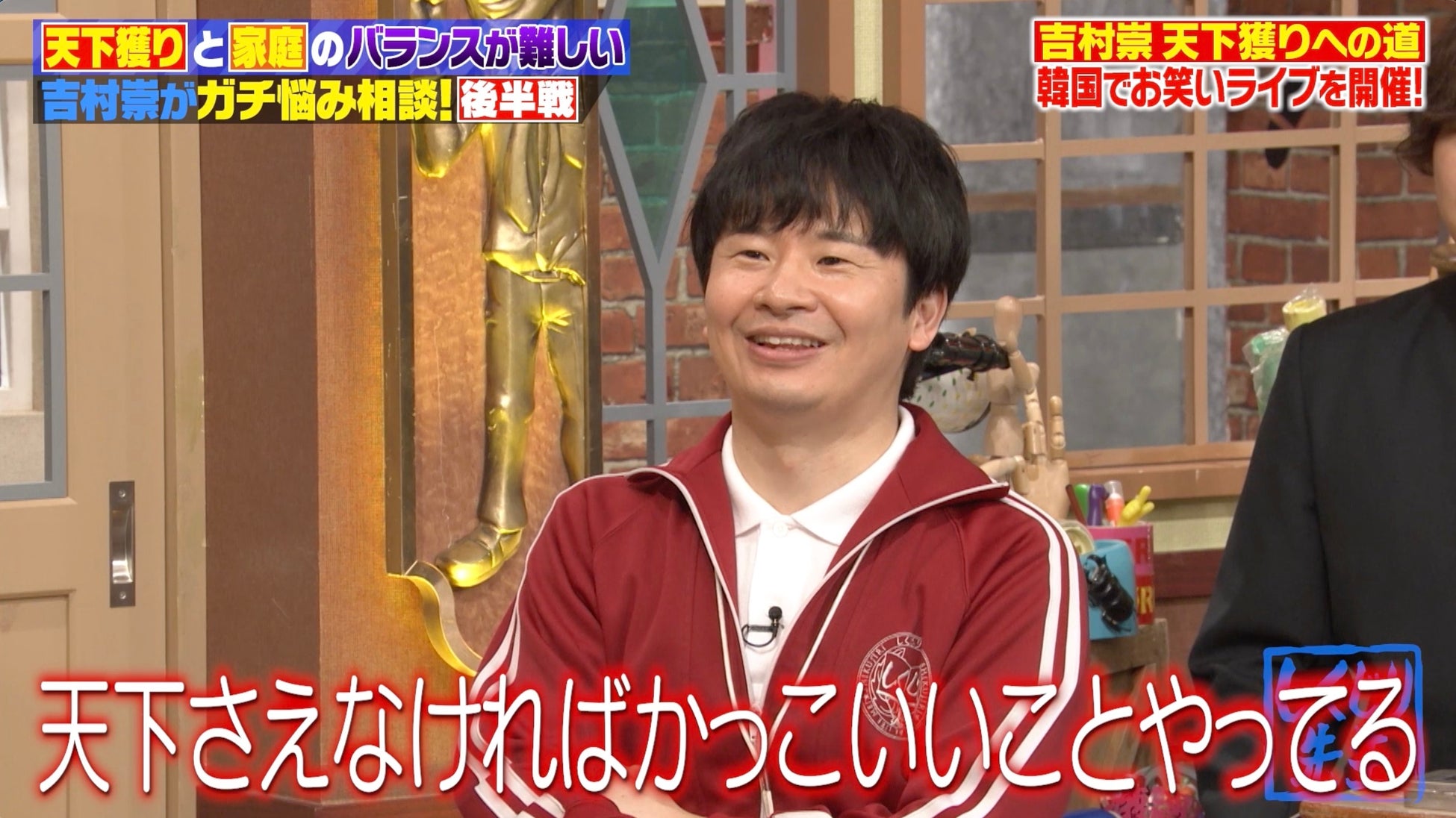 そんな中、“天下”とは「国民全体を巻き込む“熱気”」だと言い、つまりは「国民全体が吉村のことしか考えられない状態」と説明した吉村さん。「売れない中年芸人を救って熱気にしたい」という思いから、自らが発起人となり「東京NSC30周年記念ライブ&海外公演」を開催したと明かしました。そんな吉村さんの活動に若林さんは「実際吉村くん動いてるじゃん。かっこいいなと思う」としながらも、「天下さえなければかっこいいことやってる」「天下だけやめてもらいたい」と苦笑しました。