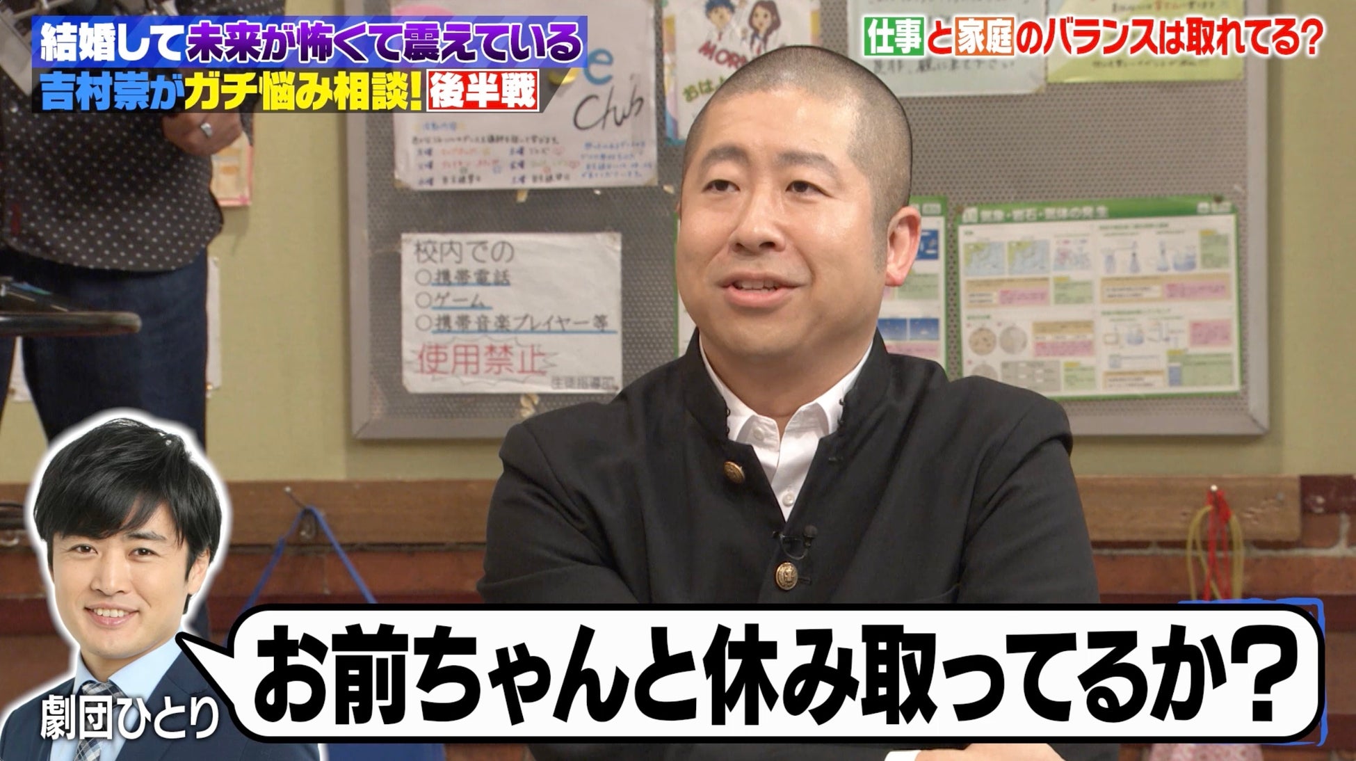 結婚後の悩みとして「仕事と家庭のバランスが難しい」と語った吉村さんは、結婚して家庭を持った今でも「“天下獲り”を諦めきれない」と打ち明けます。どのように仕事と家庭のバランスをとっているのかという吉村さんの疑問に、お笑いコンビ・オードリー若林正恭さんは「家庭の時間を増やすために(仕事を)減らしている」「(天下は)もう頭の中にない」と回答。また、お笑いコンビ・ハライチの澤部佑さんは「劇団ひとりさんに『ちゃんと休み取ってるか?』『お前はもう休んだ方がいいぞ』『もう十分働いたよ』って言ってもらった」「“家庭かな”とその時になった」と、それきっかけに週1で休みをもらうようになったと語りました。