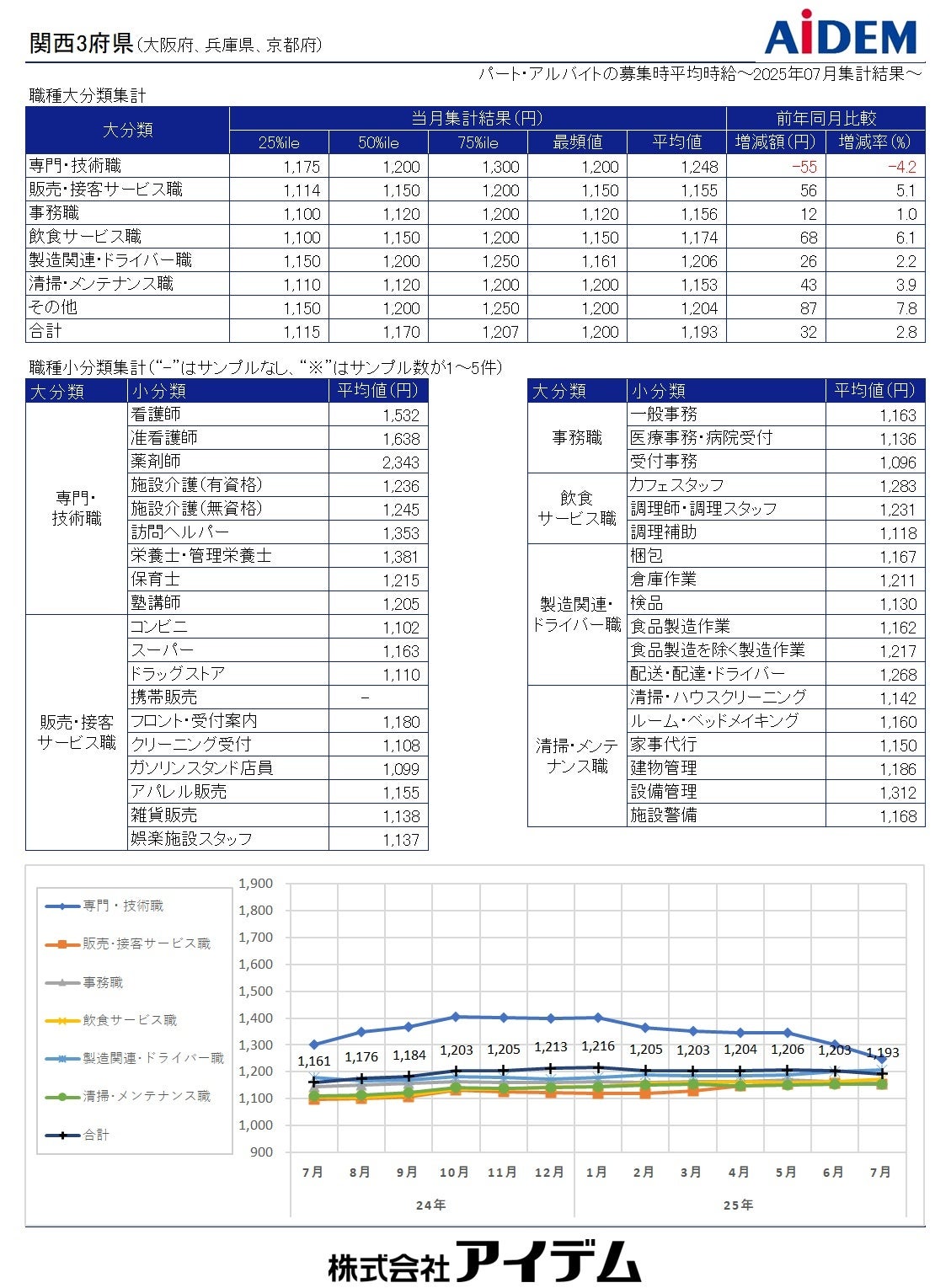 職種大分類別の平均時給は、「専門・技術職」1,248円(前年同月比55円減)、「製造関連・ドライバー職」1,206円(同26円増)、「飲食サービス職」1,174円(同68円増)、「事務職」1,156円(同12円増)、「販売・接客サービス職」1,155円(同56円増)、「清掃・メンテナンス職」1,153円(同43円増)の順で、前年同月比でプラスが5職種、マイナスが1職種となった。府県別の平均時給は、大阪府1,212円(前年同月比19円増)、兵庫県1,168円(同39円増)、京都府1,163円(同59円増)の順となり、前年同月比で全ての府県がプラスとなった。