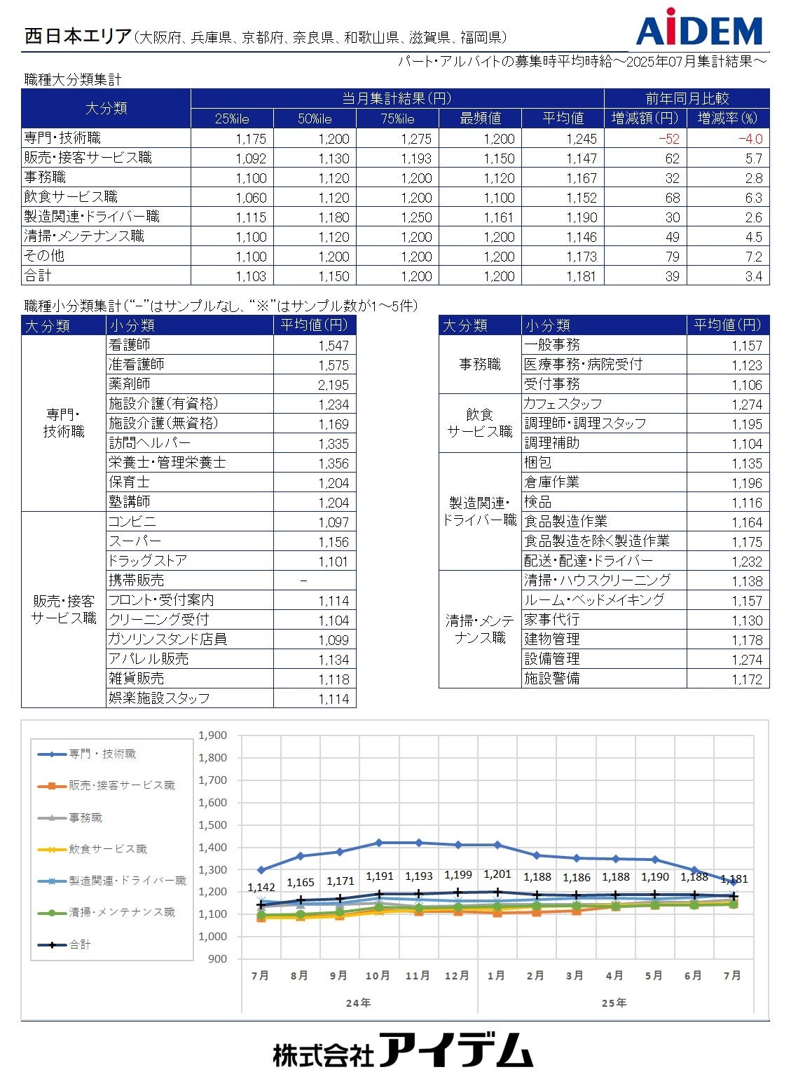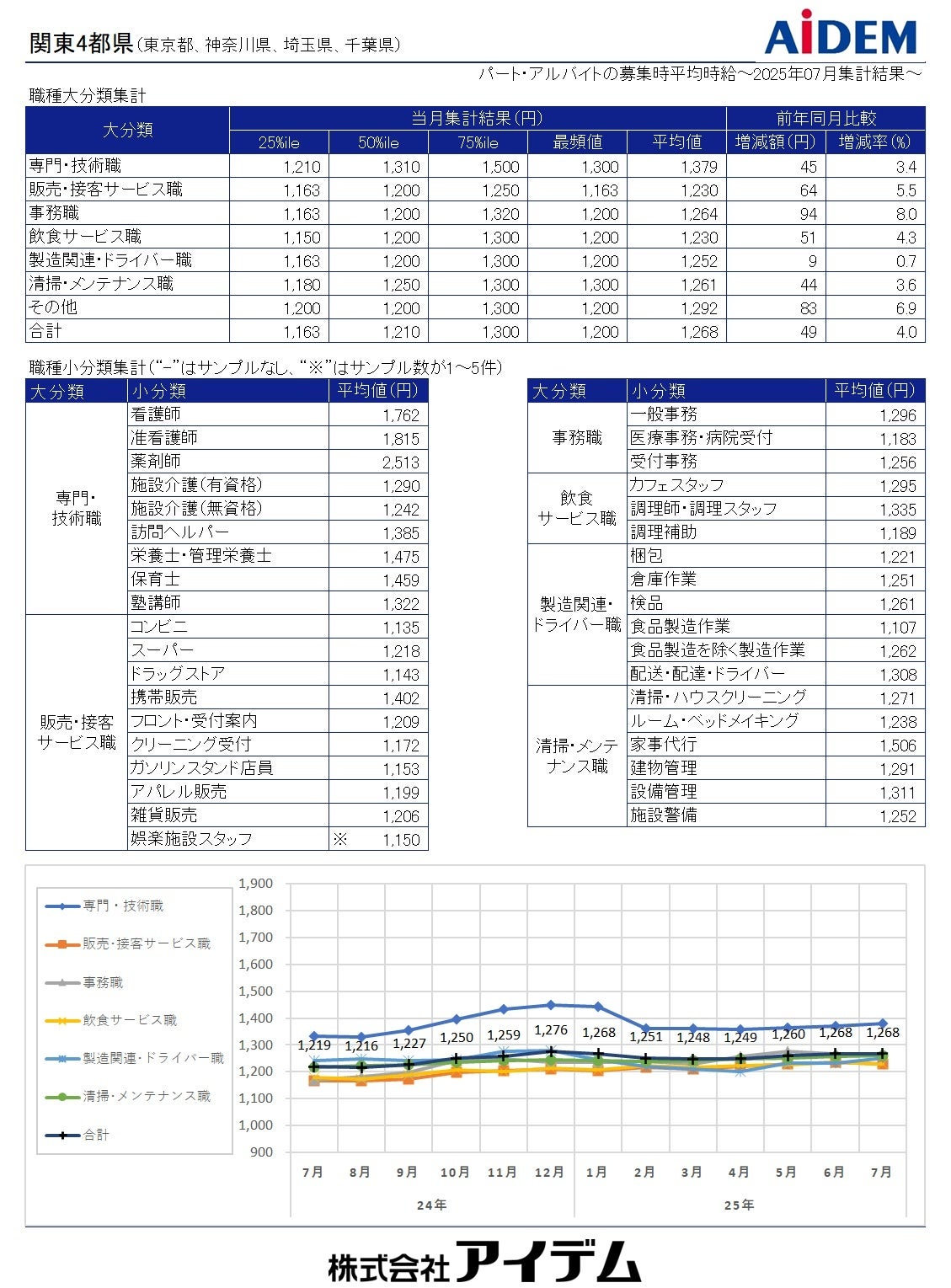 総合人材情報サービスの株式会社アイデム(本社:東京都新宿区 代表取締役社長:椛山 亮)は、求人メディア『イーアイデム』や採用ホームページ構築サービス『Jobギア採促』を利用して公表された求人情報から、2025年7月のパート・アルバイト募集時平均時給を集計いたしました。