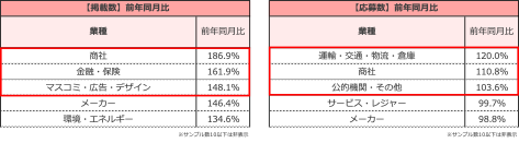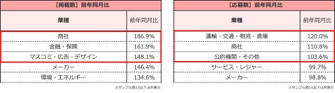 業種別の掲載数は、1月も業種大分類12業種すべてが前年同月と比べて増加した。個別では「商社」が前年同月比186.9%で最も増加し、次いで「金融・保険」が161.9%、「マスコミ・広告・デザイン」が148.1%となった。
