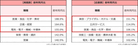 職種別の掲載数では、職種大分類16職種のうち、14職種が前年同月比で増加。中でも「医薬・食品・化学・素材」が前年同月比188.9%と最も高く、次いで「企画・経営」が164.6%、「電気・電子・機械・半導体」が155.0%だった。