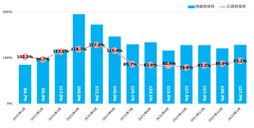 2022年1月の掲載数は前年同月比127.9%。応募数は前年同月比93.2%。企業の求人意欲は高いまま推移。求職者も少しずつ応募が増加傾向。