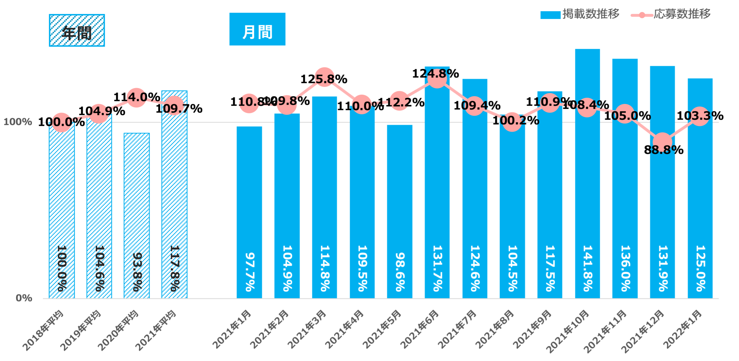 2018年平均を基準とした平均推移との比較では、2022年1月は掲載数125.0%、応募数は103.3%と、企業の中途採用意欲が高いまま推移していることが分かる【図1_2】