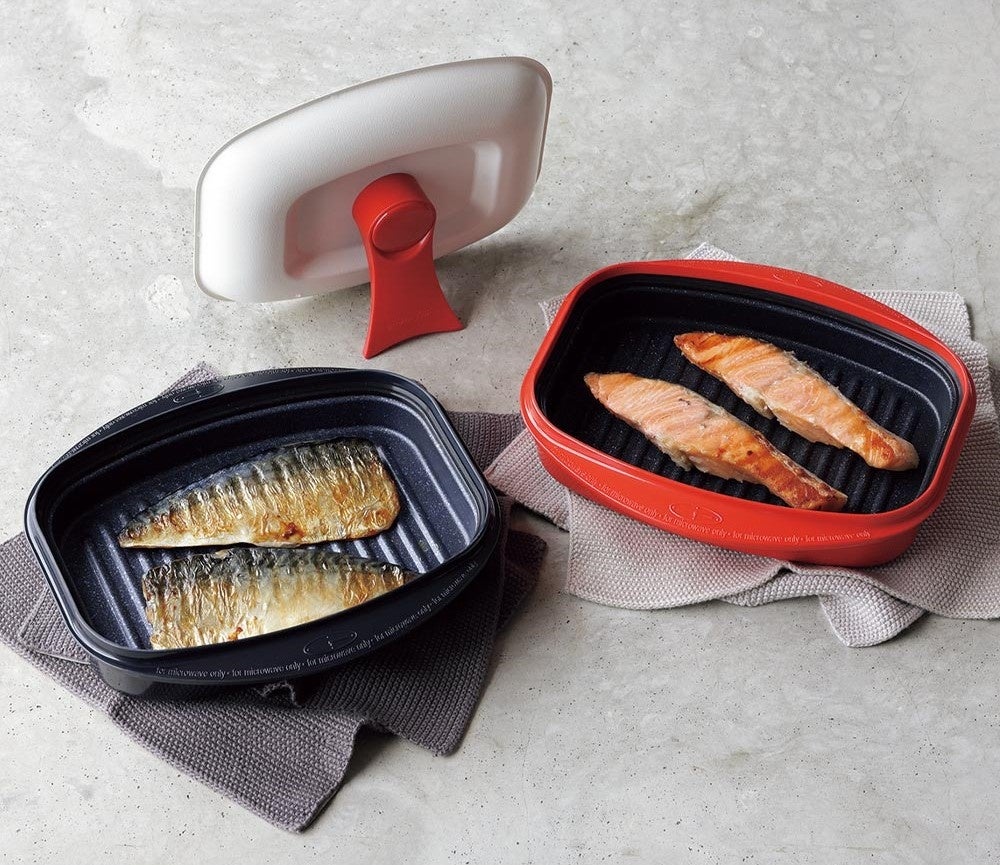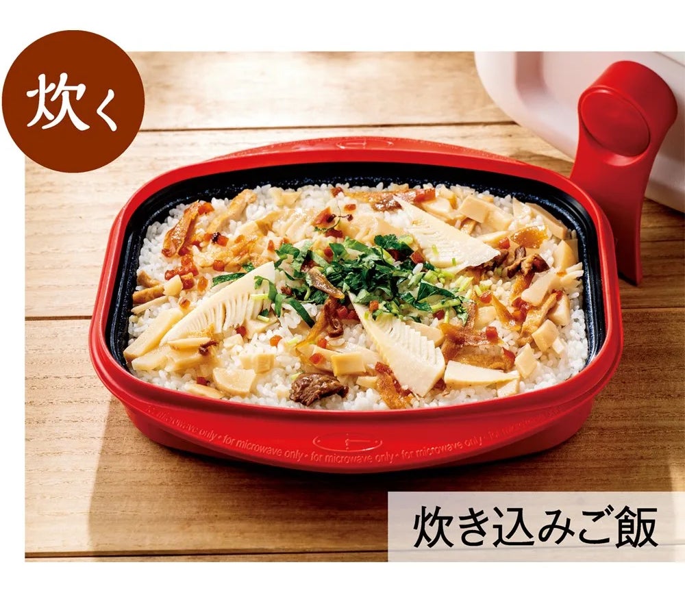 ディノス限定販売の使い勝手がいい長方形が大ヒット中です。食材を入れて、電子レンジでチンするだけで香ばしい「焼き目」がつけられる驚きの調理器で、魚や肉をレンジに入れるだけでおいしく調理できることで人気を得ています。「焼く」「炒める」「蒸す」「茹でる」「炊く」「煮る」「温めなおす」「アレンジ」など多彩な調理ができます。