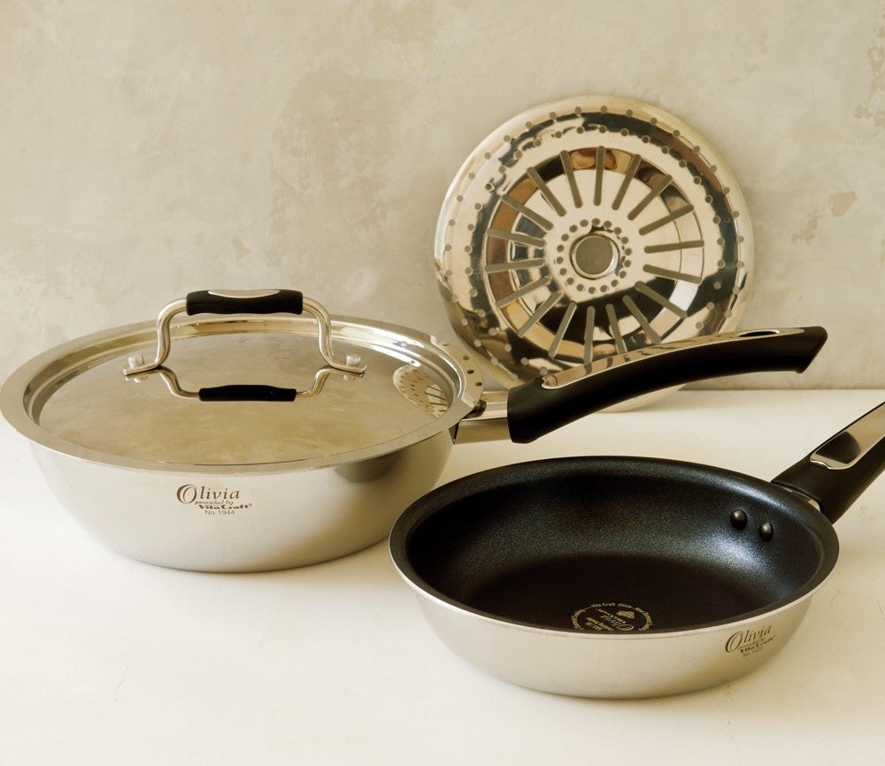 ビタクラフトの技術が活きるオリビアの「dinos企画の無水フタ付き超お得なスペシャルセット」。デザインの美しさと、料理がおいしくできると人気です。