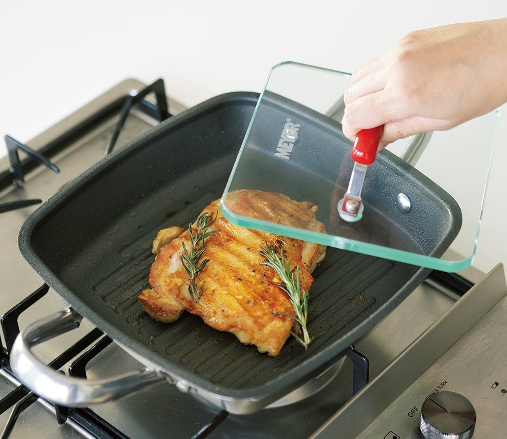 「賛否両論」店主の笠原将弘さんが愛用しているマイヤー社製品のスクエアグリルパン。グリルプレスというガラス製の重しがついたグリルパン。グリルプレスを食材の上に置いておくだけで焼き料理が美味しくなります。