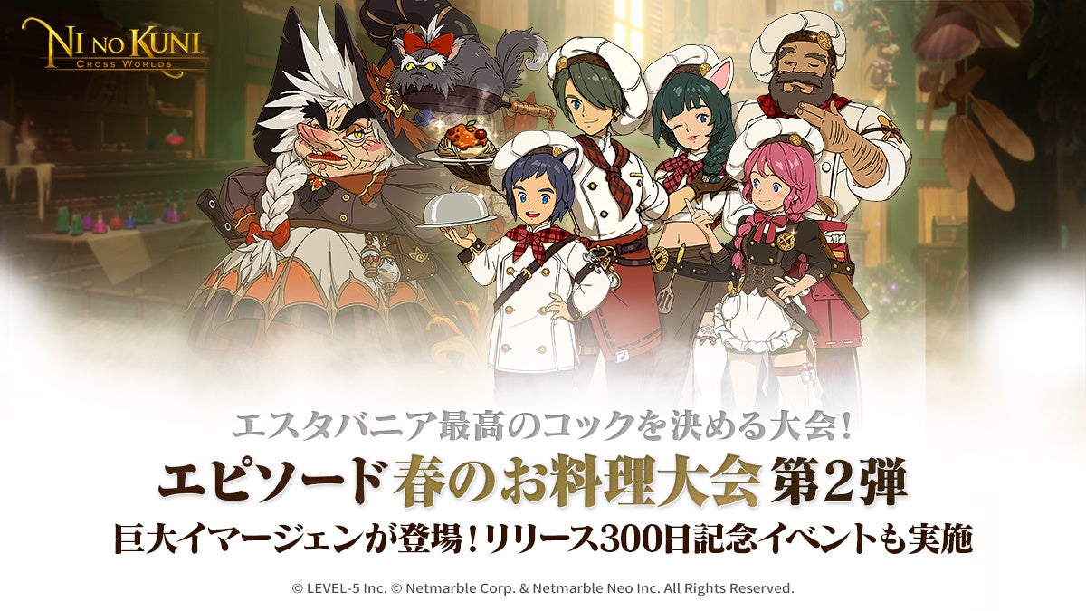 ネットマーブルは、レベルファイブとタッグを組みスマートフォン向けに開発したファンタジーアートRPG『二ノ国:Cross Worlds』(略称:ニノクロ)において、本日4月7日(木)に、現在進行中の新エピソード「春のお料理大会」の第2弾コンテンツを追加するアップデートを実施いたしました。また、リリース300日を記念してお得なイベントを多数実施することも併せてお知らせいたします。