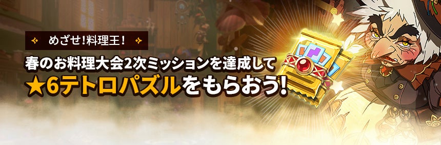 エピソード「春のお料理大会」に関連するイベントミッションを達成することで、ウリボンビスケットやお料理魔女の秘伝おもちゃボックスなどのミッション報酬のほか、ミッションポイントを獲得できます。ミッションポイントは獲得総量に応じて★5~★6のテトロパズルパックを獲得できます。