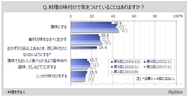 料理をする人に、料理の味付けで気をつけていることを聞いたところ(複数回答)、「薄味にする」が38.9%、「素材の味をなるべく生かす」が26.5%です。