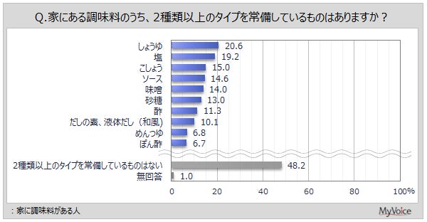 家に調味料がある人が、2種類以上のタイプを常備している調味料は(複数回答)、「しょうゆ」が20.6%、「塩」が19.2%、「こしょう」「ソース」「味噌」「砂糖」が13~15%です。