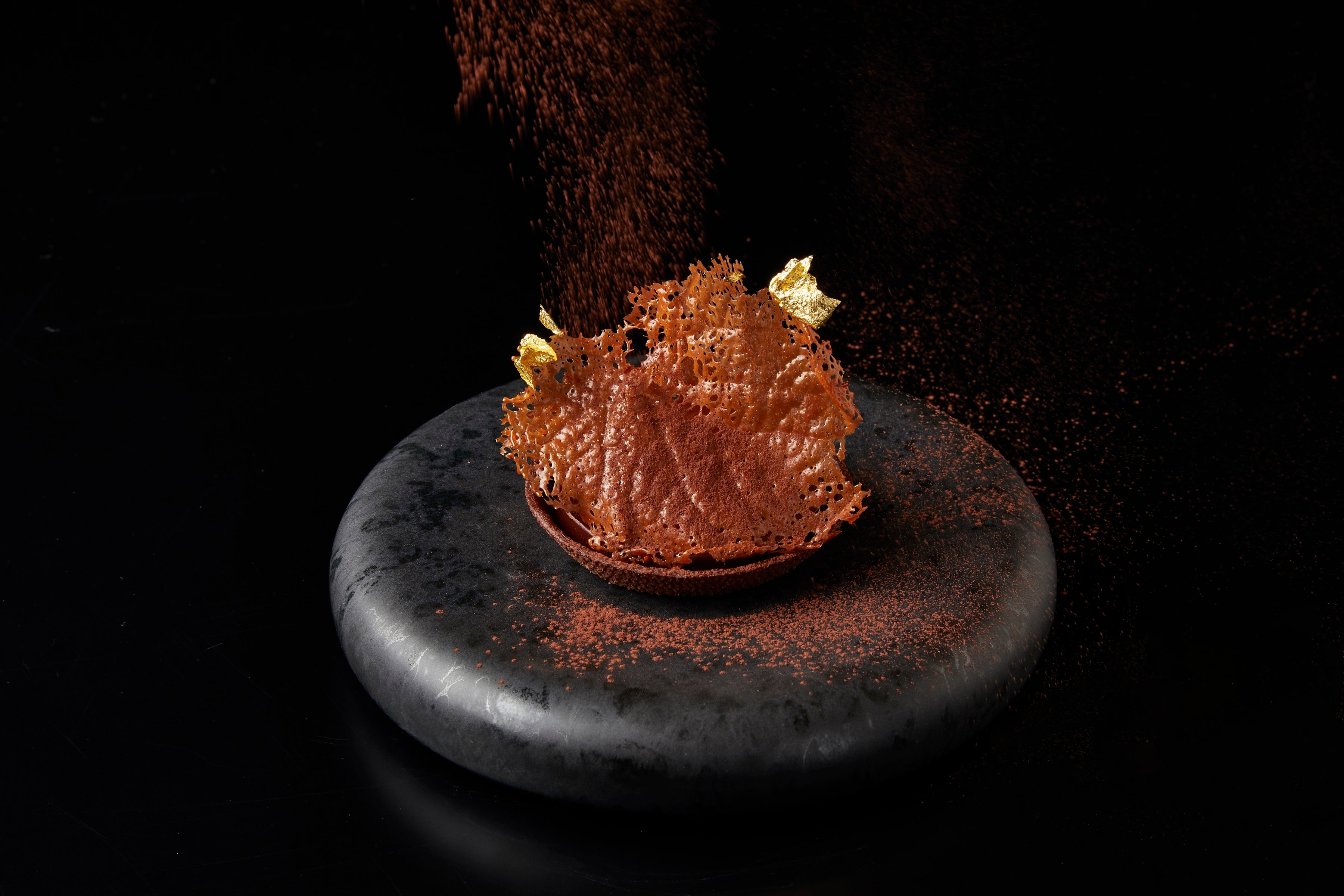 コース料理を締めくくるのは、パリパリ食感のチョコレートのチュイルと金箔が飾られた口どけ滑らかな温かいチョコレートタルトです。さっくりとしたタルトにヴァローナ社のセミビターチョコレートの「エクアトリアール・ノワール」とフルーティーな酸味が特徴の「タイノリ」、チョコレート本来の苦みと持続性のある香りが特徴の「グアナラ」の3種を使用したガナッシュを合わせました。