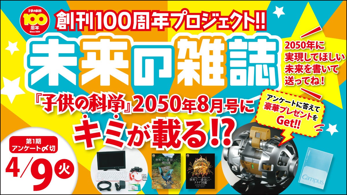 《未来の雑誌》をつくる『子供の科学』創刊100周年プロジェクト! 2050年の未来アンケートに答えて豪華プレゼントを当てよう
