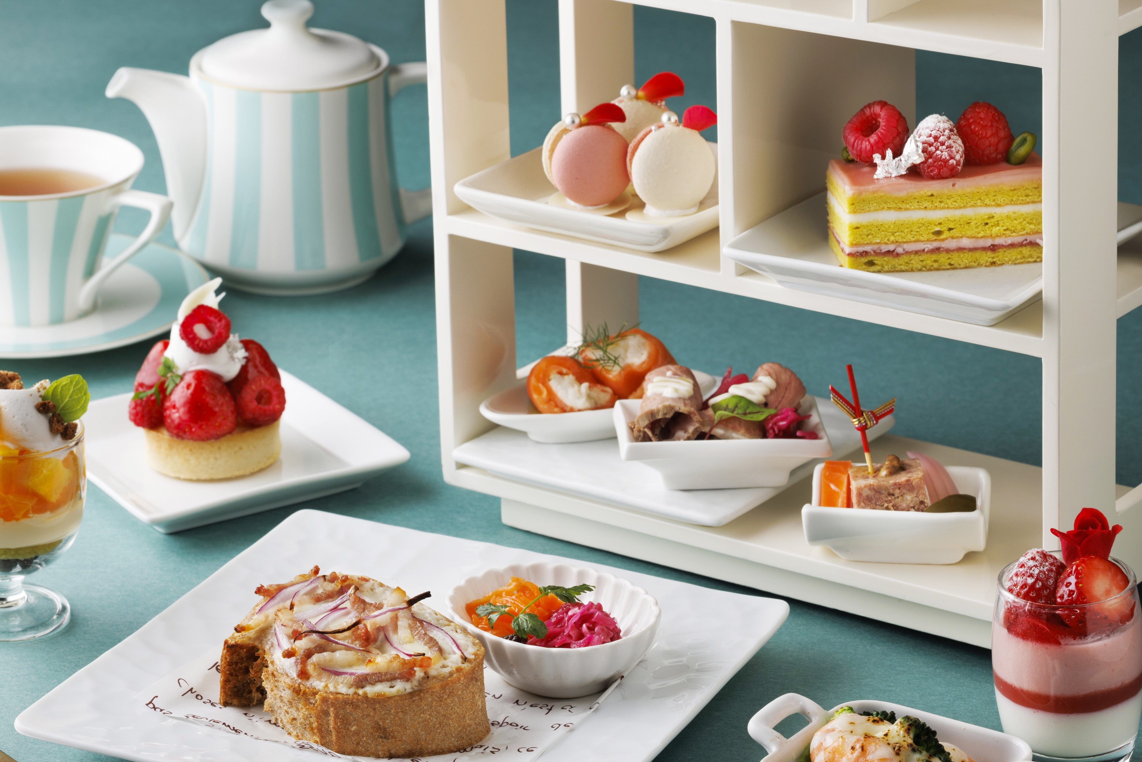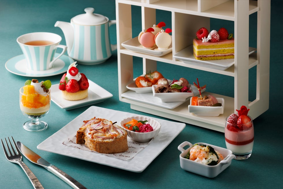 ロビーラウンジにて大好評のトワイライトハイティーでは、季節感あふれる5種のスイーツ、センスが光る4種のセイボリーに、ボリュームのあるメインディッシュ、アロマティックなウェルカムティーと14種から選べるティーセレクションが魅力的なラインナップで、至福のひとときを提供いたします。