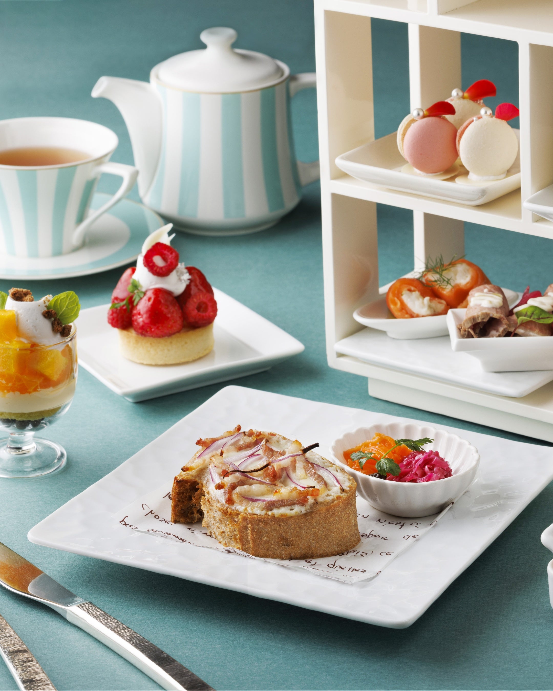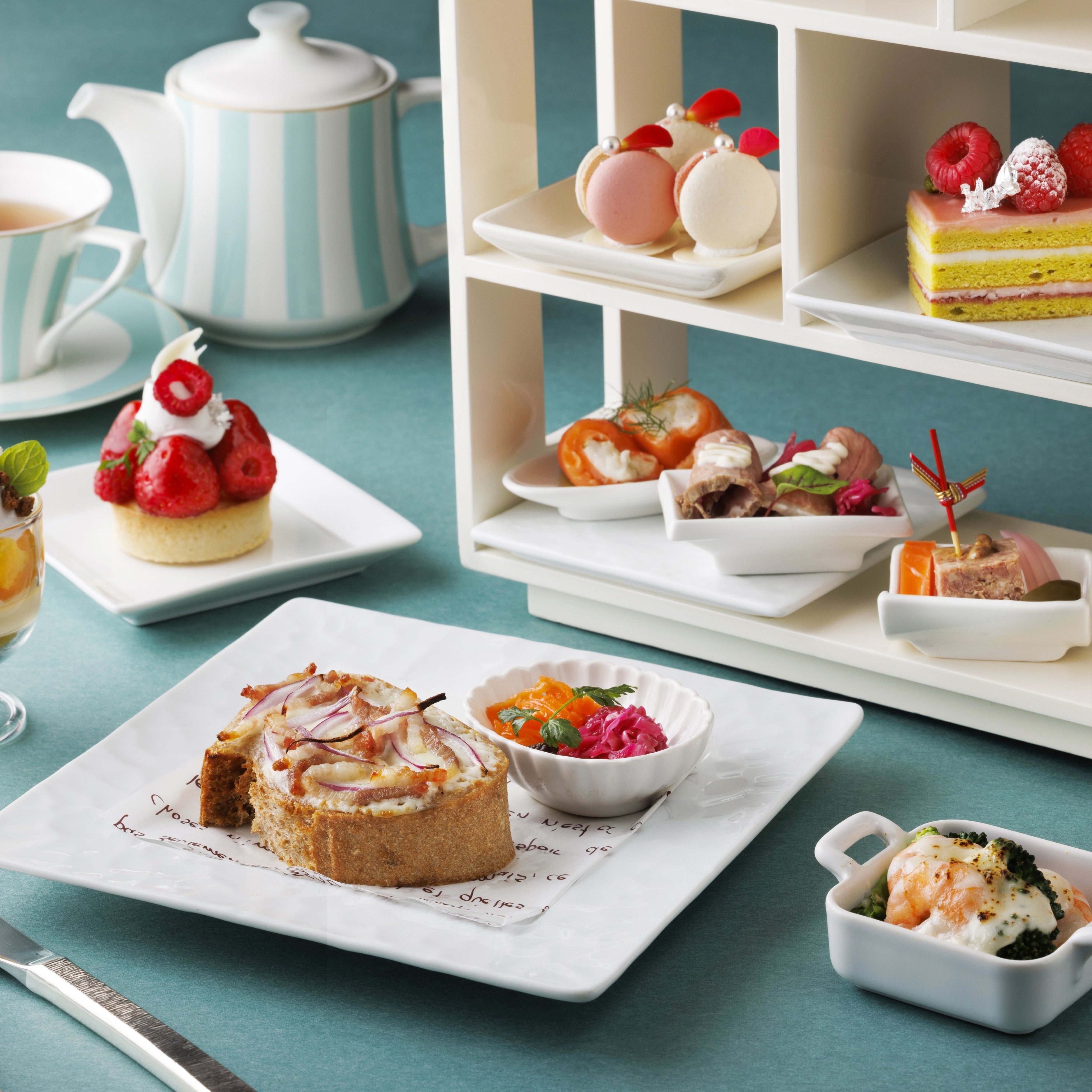 4種のセイボリーは、甘さの合間に嬉しい、パテ・ド・カンパーニュやローストビーフなど、心地よい塩味が甘いスイーツとの絶妙なバランスで食欲をそそる逸品が揃います。全粒粉パンにチーズがとろけるパンコンプレのタルトフランベ風トーストは、カラダもココロも温まる一品です。