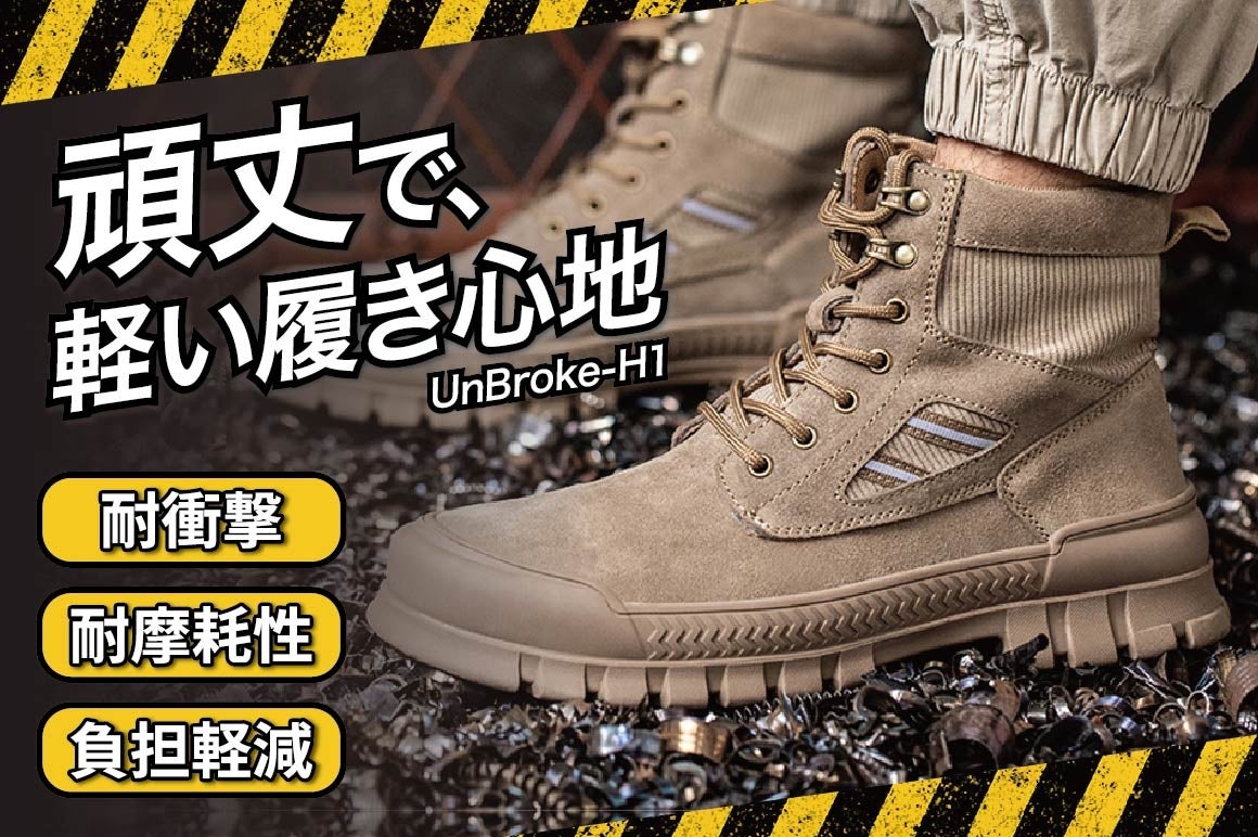 基本的に安全靴はクリティカルな現場での使用を想定したつくりになっていますが、UnBroke-H1(アンブローク・エッチワン)は軽量化されたボディや通気性の優れた内部設計、さらには普段使いしやすいカジュアルなデザインなど幅広いユーザーのこと想ってつくられています。