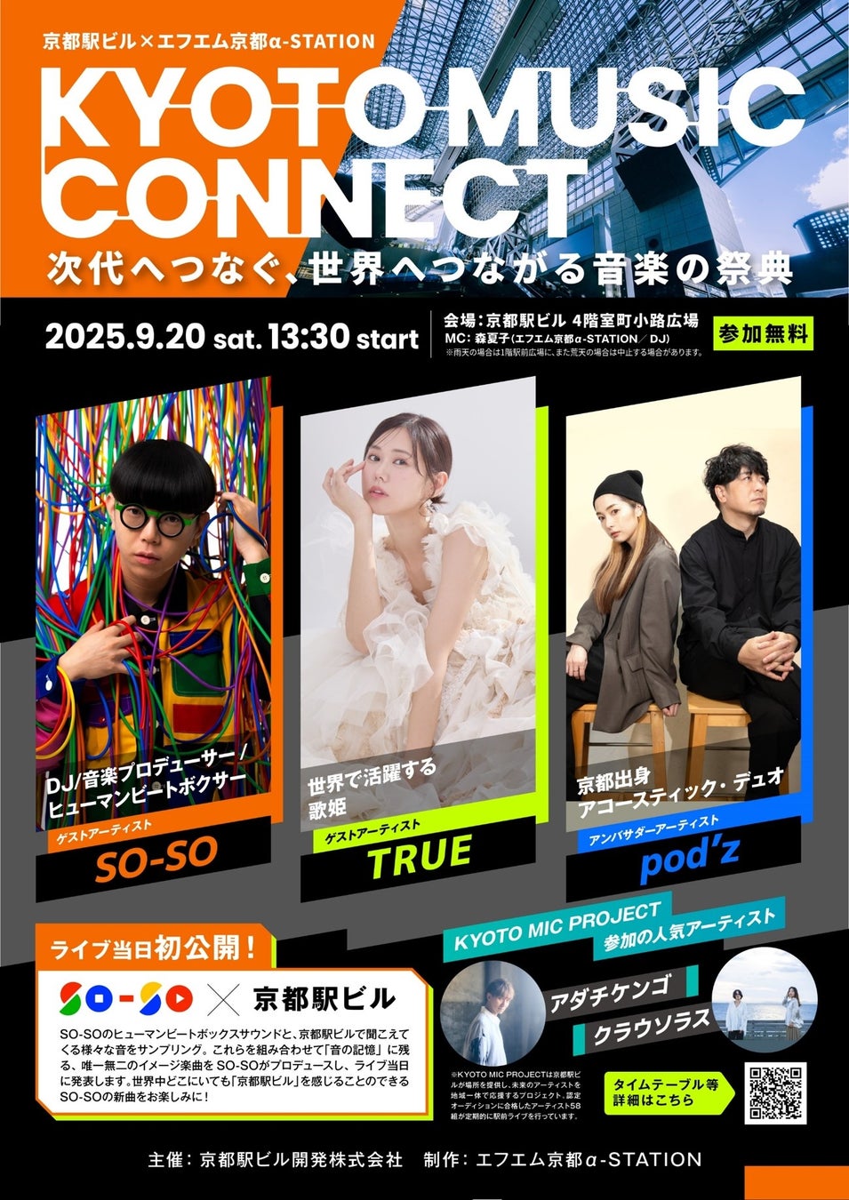 ゲストアーティストとして、ヒューマンビートボックス界の革命児で DJ/音楽プロデューサーの「SO-SO」と、世界を舞台に活躍する歌姫「TRUE」が登場!! また、地元FM局「α-STATION」の人気DJとしても知られる京都出身のアコースティックデュオ「pod’z」がアンバサダーアーティストとして出演します。